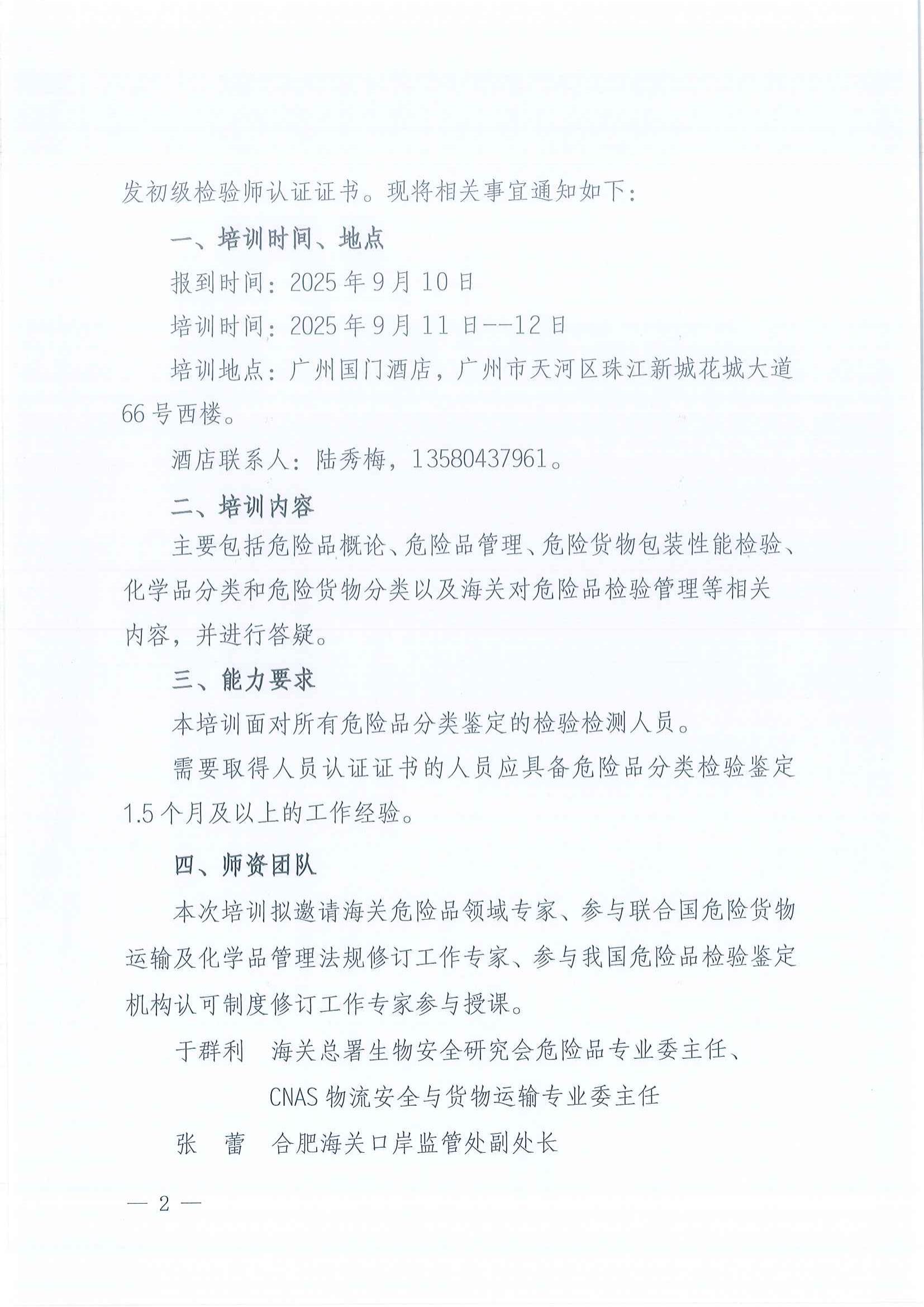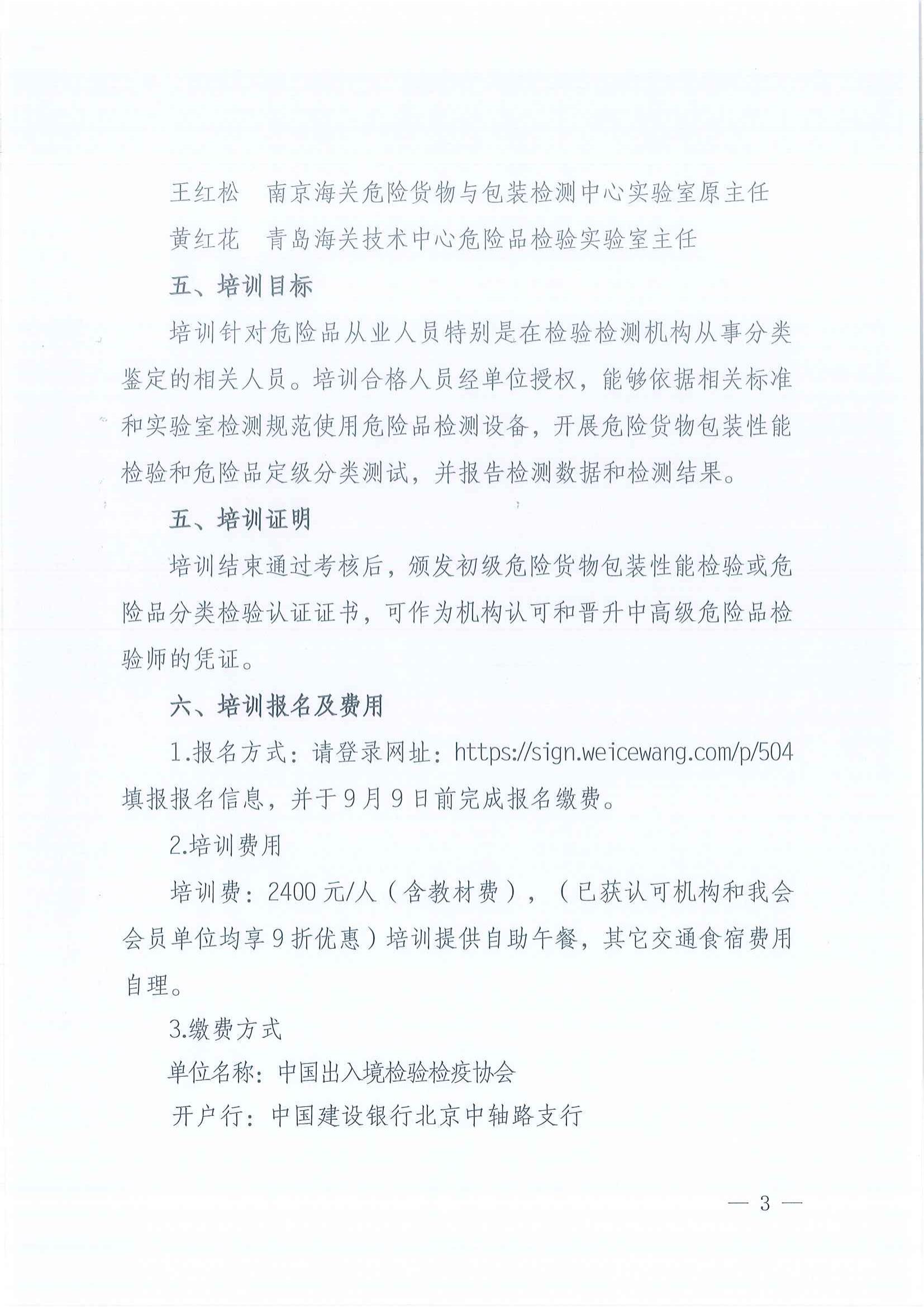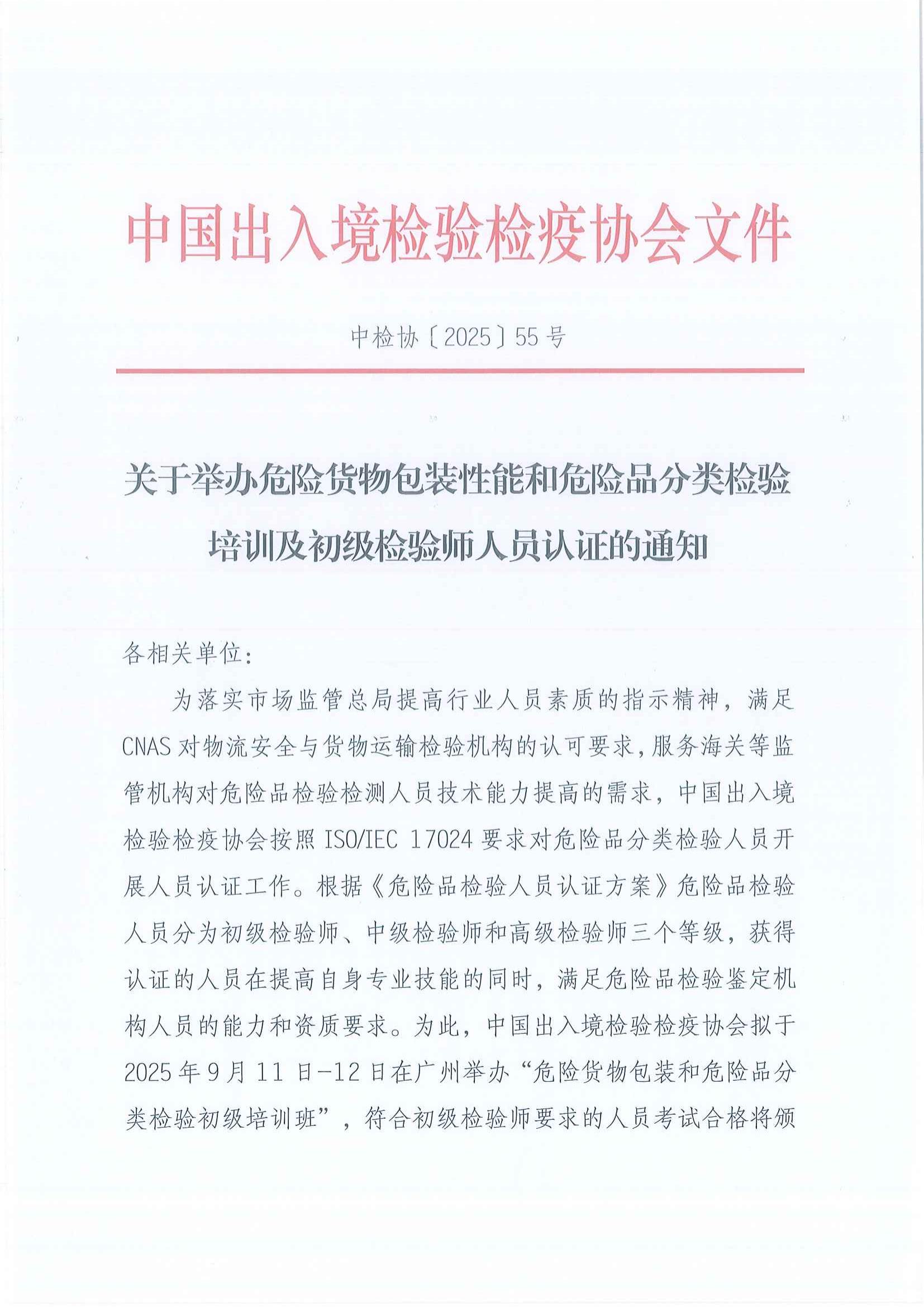 您现在的位置是:首页 > 工作动态 关于举办危险货物包装性能和危险品分类检验培训及初级检验师人员认证的通知 发布日期:2025-11-12 字体: 【小】 【中】 【大】 分享: 热门文章: 接棒启新航 聚力向未来 | 中国出入境检验检疫协会第六届第一次会员代表大会[2026-01-28] 检测和校准实验室认可技术培训班在西安成功举办[2025-12-16] 重磅!中国出入境检验检疫协会国际贸易便利化分会正式成立[2025-11-22] 第七届国际检博会圆满举办:链动全产业链,共启检验检测新生态[2025-11-17] 中国出入境检验检疫协会参加第八届中国国际进口博览会及相关活动[2025-11-11] 海关资讯 2025年港珠澳大桥口岸进出口货值超3000亿元 去年全国海关查获外来物种5439批次——防范口岸入侵风险取得突出成效 覆盖全球约1/3经济总量,RCEP正式生效四年了——“家门口”的外贸生意越来越旺 粤港澳大湾区内地九市外贸规模创历史新高 海关总署公告2026年第12号(关于启动进出口货物多式联运(海铁、水水部分)业务模式试点相关事项的公告) 海关总署 农业农村部公告2026年第11号(关于解除巴西南里奥格郎德州新城疫疫情禁令的公告) “十五五”时期海关将适度扩大进口 海南自贸港封关运作“满月”