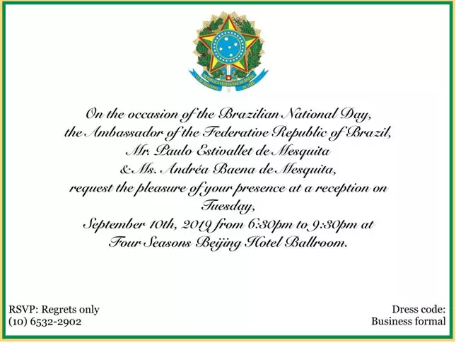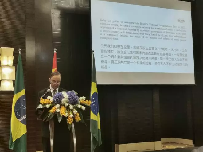 2019Äê9ÔÂ10ÈÕ£¬Ó¦°ÍÎ÷Áª°î¹²ºÍ¹úפ»ª´óʹ¹ÝµÄÑûÇ룬Öйú³öÈë¾³¼ìÑé¼ìÒßлáÃØÊ鳤¶ÎСºì£¬¹ú¼ÊºÏ×÷²¿ÁõÖÇÓÂÖ÷ÈÎÒ»ÐУ¬ÔÚ±±¾©Ëļ¾¾Æµê²Î¼Ó°ÍÎ÷Áª°î¹²ºÍ¹ú½¨¹ú132ÖÜÄê¹úÇìÕдý¾Æ»á¡£