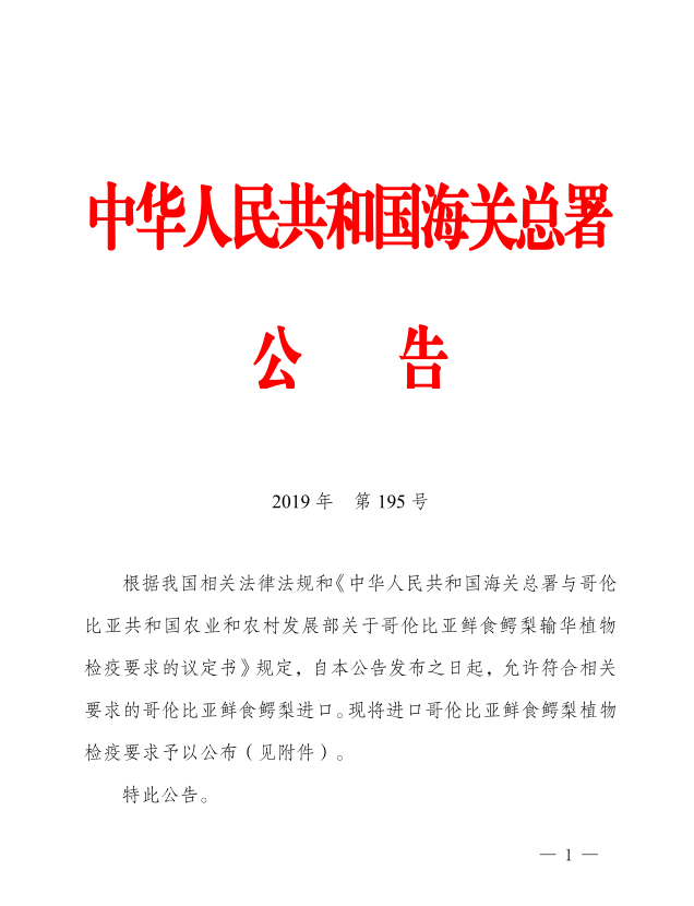 2019Äê7ÔÂ31ÈÕ£¬ÔÚ¹ú¼ÒÖ÷ϯϰ½üƽÓë¸çÂ×±ÈÑÇ×Üͳ¶Å¿ËµÄ¹²Í¬¼û֤ϣ¬º£¹Ø×ÜÊðÊð³¤ÄßÔÀ·åÓë¸çÂ×±ÈÑÇũҵºÍÅ©´å·¢Õ¹²¿²¿³¤ÍßÂ×Î÷Ñǹ²Í¬Ç©ÊðÁË¡¶ÖлªÈËÃñ¹²ºÍ¹úº£¹Ø×ÜÊðÓë¸çÂ×±ÈÑǹ²ºÍ¹úũҵºÍÅ©´å·¢Õ¹²¿¹ØÓÚ¸çÂ×±ÈÑÇÏÊʳöùÀæÊ仪ֲÎï¼ìÒßÒªÇóµÄÒ鶨Êé¡·£¬À¿ªÁ˸çÂ×±ÈÑÇÏÊʳöùÀæÊ仪µÄÐòÄ»¡£