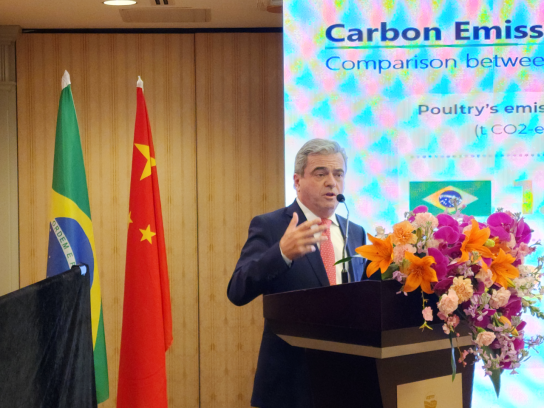 巴西动物蛋白协会(ABPA) 主席,里卡多-若昂-桑廷先生做了题为“中巴动物蛋白互补优势”的主题演讲。里卡多主席分析了巴西动物蛋白行业的资源及技术特点,巴西至今无非洲猪瘟和禽流感的优势,以及行业低碳排放的可持续发展;同时他也讲述了巴西禽肉和猪肉出口的产品特点以及对中国市场的补充性。尊重环境和保护资源始终贯穿巴西畜牧业的发展,中巴之间的互补优势在蛋白产品方面随着巴西动物蛋白协会代表团的访问得到进一步加深。