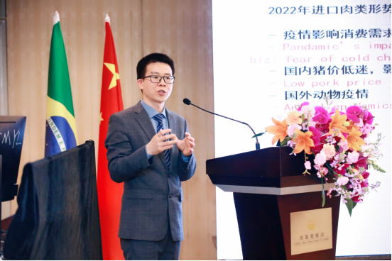 优合集团优顶特研究院院长杨彬彬做题为“如何构建更为稳健的中巴肉类跨境供应链”的主题演讲,介绍了中国进口肉类贸易现状和趋势,以及巴西肉类的优势与挑战,随后介绍了优合集团致力于通过物流、商流、资金流、信息流“四流合一”、线上线下相结合的“优合模式”,各方面全面提升进口肉类供应链服务水平、保障消费需求、促进贸易发展。