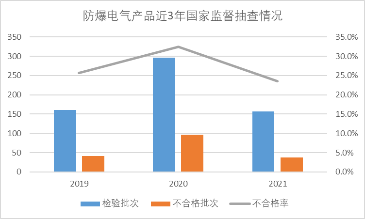 £¨¶þ£©·À±¬µçÆø²úÆ·³é²é½á¹û·ÖÎö¡£±¾´Î³é²éÁË158¼ÒÆóÒµÉú²úµÄ159Åú´Î·À±¬µçÆø²úÆ·£¬¼ìÑé157Åú´Î£¬·¢ÏÖ37Åú´Î²úÆ·²»ºÏ¸ñ£¬²»ºÏ¸ñ·¢ÏÖÂÊΪ23.6%£¬ÆäÖзÀ±¬µÆ¾ßºÍ·À±¬µç»úµÄ²»ºÏ¸ñ·¢ÏÖÂʾù³¬¹ý25%¡£¸ÃÀà²úÆ·×Ô2019ÄêÖÁ2021Ä꣬ÕûÌå²»ºÏ¸ñ·¢ÏÖÂÊΪ25.6%¡¢32.4%¡¢23.6%¡£