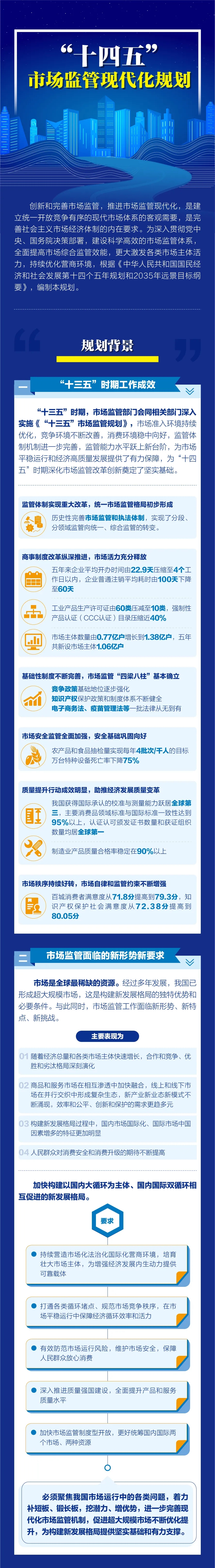 您现在的位置是:首页 > 市场监管资讯 图解“十四五”市场监管现代化规划 发布日期:2022-02-16 字体: 【小】 【中】 【大】 分享: 热门文章: 接棒启新航 聚力向未来 | 中国出入境检验检疫协会第六届第一次会员代表大会[2026-01-28] 检测和校准实验室认可技术培训班在西安成功举办[2025-12-16] 重磅!中国出入境检验检疫协会国际贸易便利化分会正式成立[2025-11-22] 第七届国际检博会圆满举办:链动全产业链,共启检验检测新生态[2025-11-17] 中国出入境检验检疫协会参加第八届中国国际进口博览会及相关活动[2025-11-11] 海关资讯 2025年港珠澳大桥口岸进出口货值超3000亿元 去年全国海关查获外来物种5439批次——防范口岸入侵风险取得突出成效 覆盖全球约1/3经济总量,RCEP正式生效四年了——“家门口”的外贸生意越来越旺 粤港澳大湾区内地九市外贸规模创历史新高 海关总署公告2026年第12号(关于启动进出口货物多式联运(海铁、水水部分)业务模式试点相关事项的公告) 海关总署 农业农村部公告2026年第11号(关于解除巴西南里奥格郎德州新城疫疫情禁令的公告) “十五五”时期海关将适度扩大进口 海南自贸港封关运作“满月”