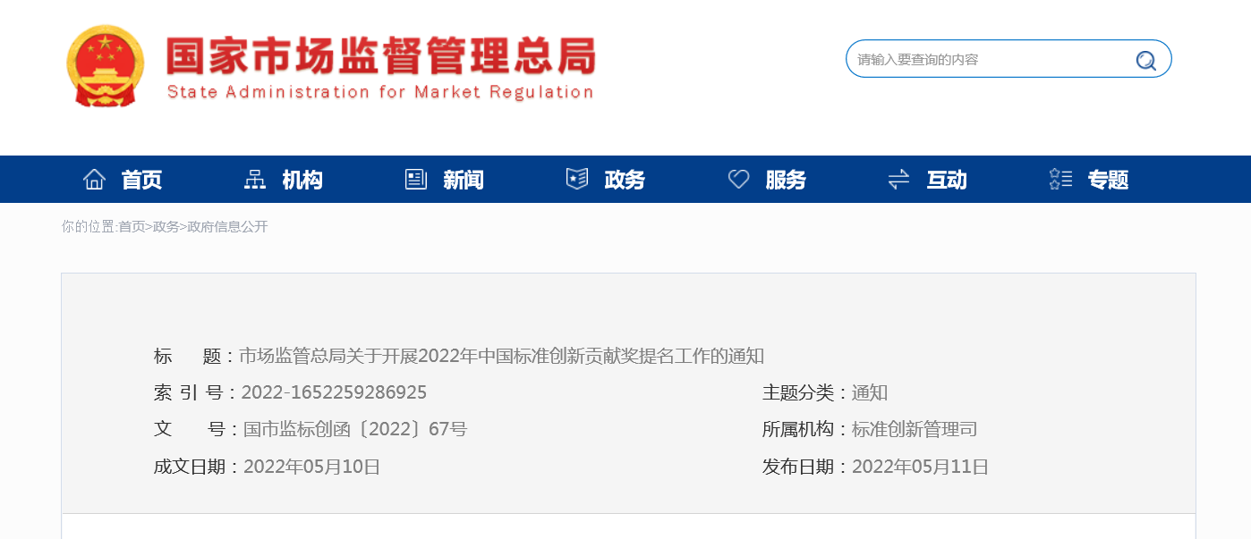 近日, 国家市场监督管理总局发布《关于开展2022年中国标准创新贡献奖提名工作的通知》,就开展2022年中国标准创新贡献奖评选活动进行部署。有关事项如下: