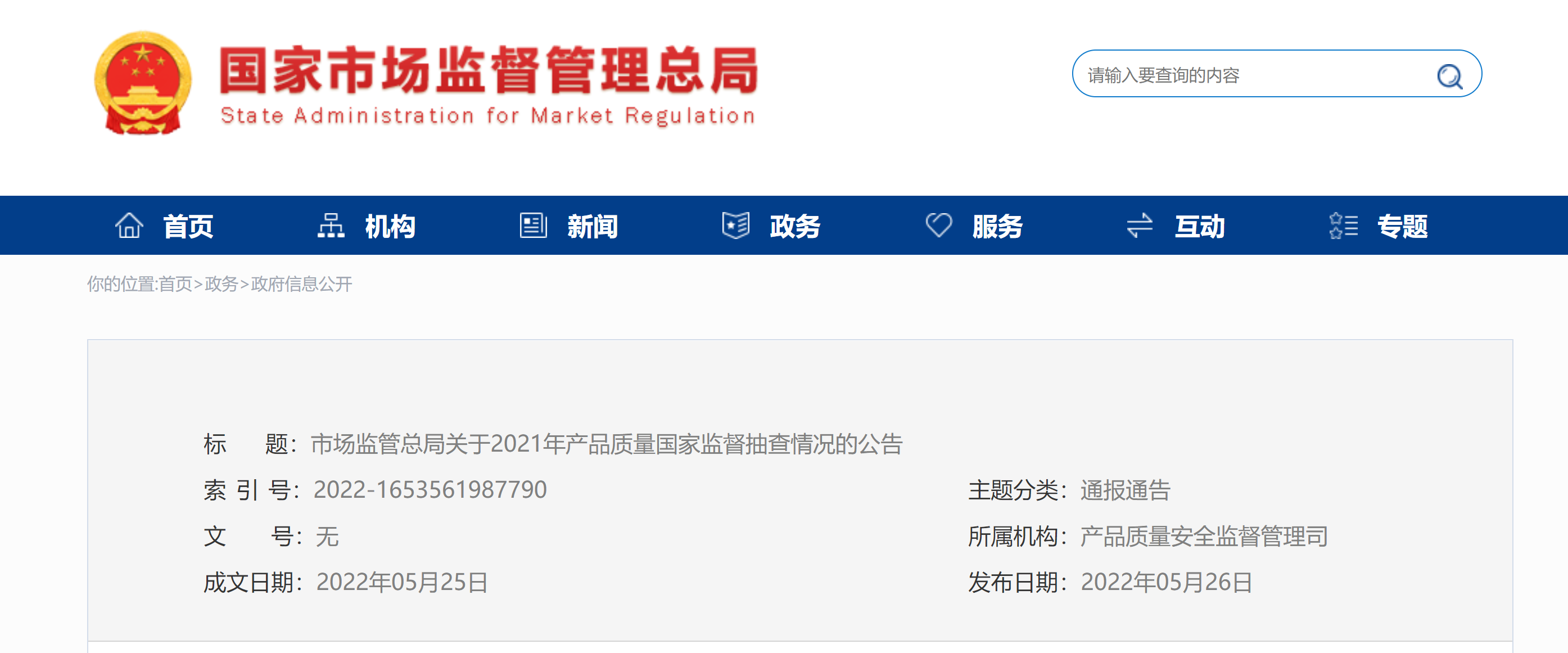 2021Äê¹ú¼Ò¼à¶½³é²é½á¹ûÒÑͨ¹ýÊг¡¼à¹Ü×ܾÖÍøÕ¾·ÖÅúÏòÉç»á¹«²¼£¬¹«ÖÚ¿Éͨ¹ýÊг¡¼à¹Ü×ܾÖÍøÕ¾¡°ÕþÎñ-×ܾÖÎļþ-ͨ±¨Í¨¸æ¡±À¸Ä¿²éѯ²»ºÏ¸ñ²úÆ·ÐÅÏ¢¡£