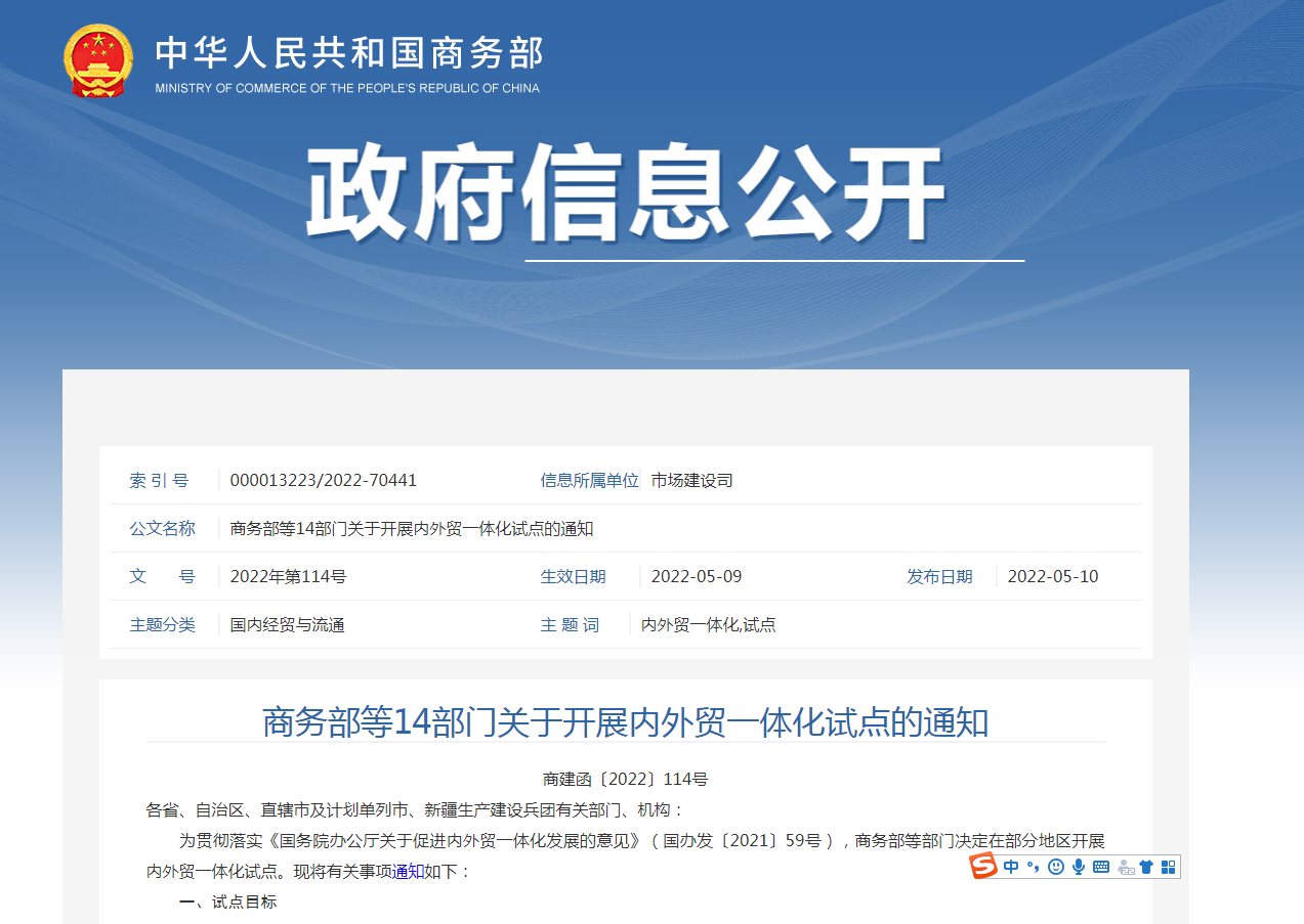 ¡¡¡¡Îª¹á³¹Âäʵ¡¶¹úÎñÔº°ì¹«Ìü¹ØÓÚ´Ù½øÄÚÍâóһÌ廯·¢Õ¹µÄÒâ¼û¡·£¨¹ú°ì·¢¡²2021¡³59ºÅ£©£¬ÉÌÎñ²¿µÈ²¿Ãžö¶¨ÔÚ²¿·ÖµØÇø¿ªÕ¹ÄÚÍâóһÌ廯ÊԵ㡣ÏÖ½«ÓйØÊÂÏî֪ͨÈçÏ£º