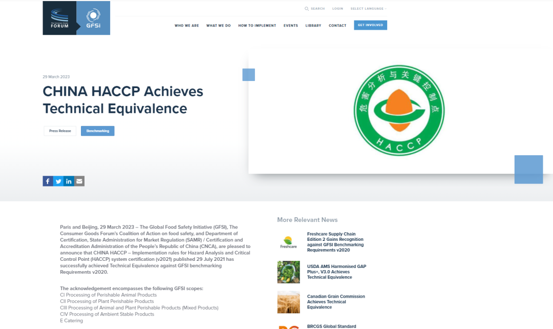 2023年3月31日,经过了双方团队近3年的技术交流,中国HACCP与全球食品安全倡议组织(Global Food Safety Initiatives, GFSI)再一次达成了互认。早在2011年,认监委就与GFSI签订了合作谅解备忘录,此次为第三次GFSI的最新基准与中国HACCP新版认证要求进行的全面制度对比,此前GFSI官网也正式发布了相关信息。