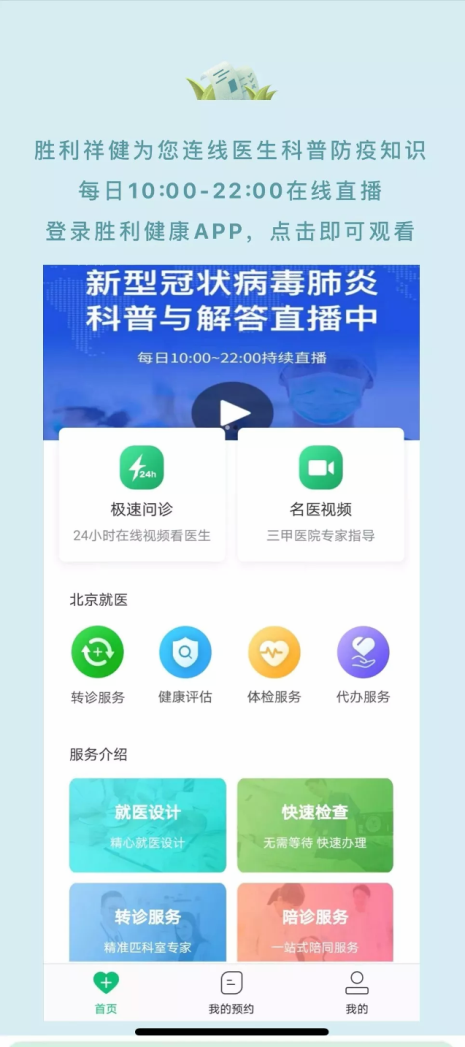 为进一步缓解当前就医压力,减少因交通出行带来的交叉感染风险,中国国际旅行卫生保健协会副会长单位北京胜利祥健科技服务有限公司开通每日在线直播,科普各类防疫知识,并提供24小时全科医生在线问诊,做到轻症慢症足不出户专业咨询;大病重症绿色通道转诊。