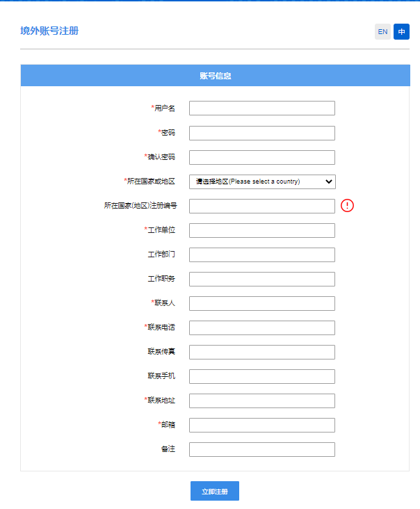 用户名、密码、工作单位(企业名称)等带*号的字段和所在国家(地区)注册编号为必填项,填写完毕后,点击【立即注册】,完成用户账号注册。 账号注册完成,请使用用户名(账号)/密码重新登录系统。