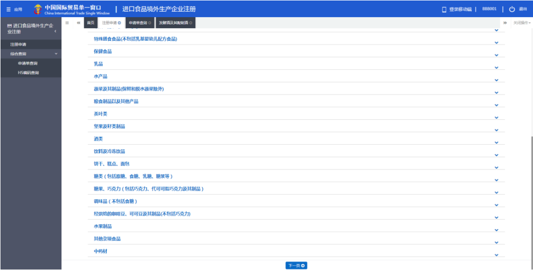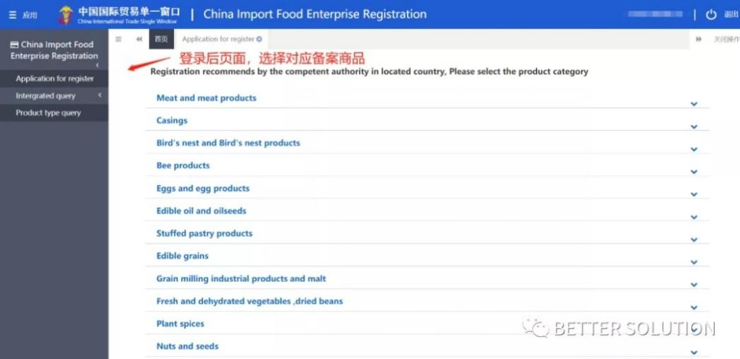 对于所在国家(地区)主管当局推荐注册的产品,境外企业使用主管当局分配的账号登录系统,点击左侧菜单“注册申请”,选择企业注册涉及的产品类别。
