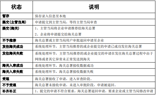 (3)提交主管当局、提交海关(推荐)、退回企业(不予推荐)、 发往海关成功、海关入库成功、审批不通过、审批通过、受理、不予受理、撤销、暂停、整改状态的申请单不允许编辑修改和申报。