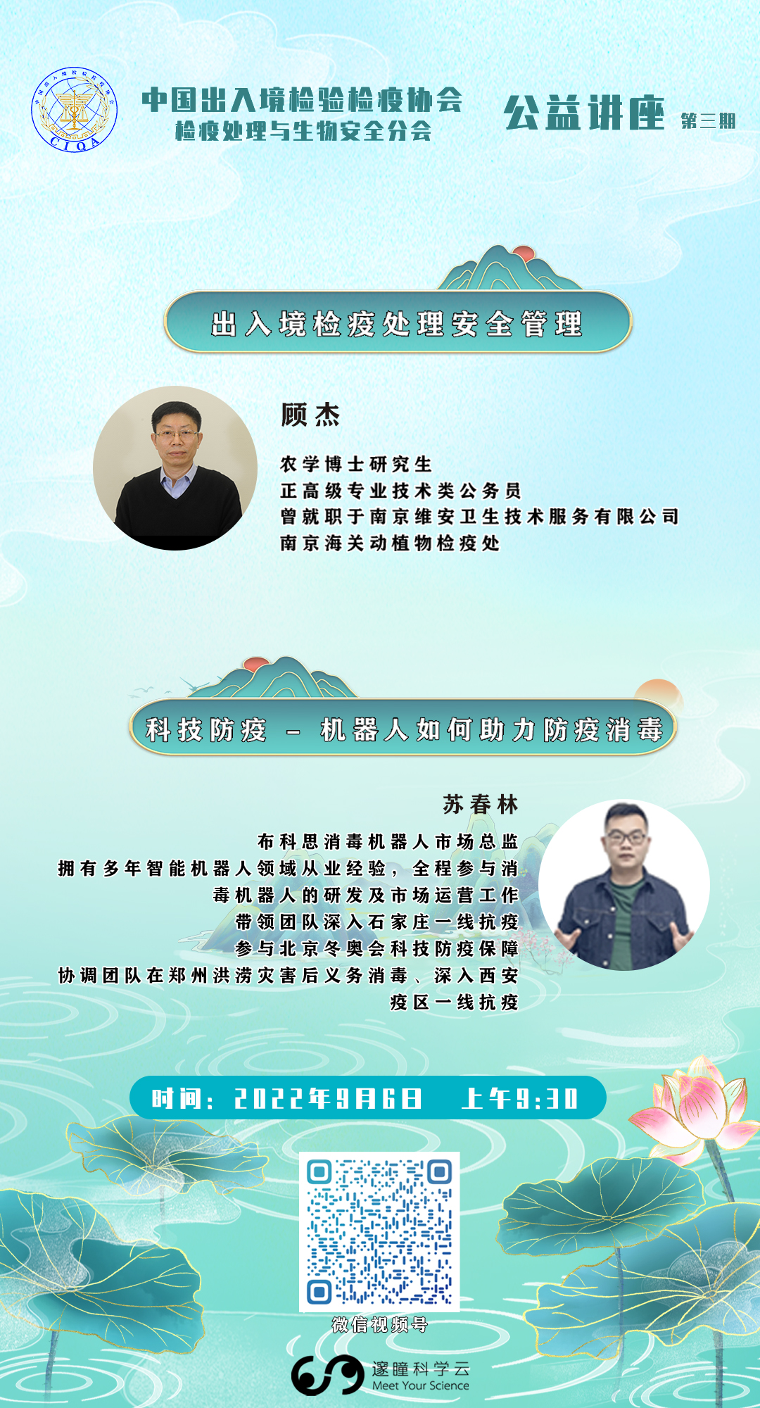 您现在的位置是:首页 > 工作动态与通知公告 9月6日 | 检疫处理与生物安全第3期公益讲座 发布日期:2022-09-01 字体: 【小】 【中】 【大】 分享: 热门文章: 接棒启新航 聚力向未来 | 中国出入境检验检疫协会第六届第一次会员代表大会[2026-01-28] 检测和校准实验室认可技术培训班在西安成功举办[2025-12-16] 重磅!中国出入境检验检疫协会国际贸易便利化分会正式成立[2025-11-22] 第七届国际检博会圆满举办:链动全产业链,共启检验检测新生态[2025-11-17] 中国出入境检验检疫协会参加第八届中国国际进口博览会及相关活动[2025-11-11] 海关资讯 2025年港珠澳大桥口岸进出口货值超3000亿元 去年全国海关查获外来物种5439批次——防范口岸入侵风险取得突出成效 覆盖全球约1/3经济总量,RCEP正式生效四年了——“家门口”的外贸生意越来越旺 粤港澳大湾区内地九市外贸规模创历史新高 海关总署公告2026年第12号(关于启动进出口货物多式联运(海铁、水水部分)业务模式试点相关事项的公告) 海关总署 农业农村部公告2026年第11号(关于解除巴西南里奥格郎德州新城疫疫情禁令的公告) “十五五”时期海关将适度扩大进口 海南自贸港封关运作“满月”