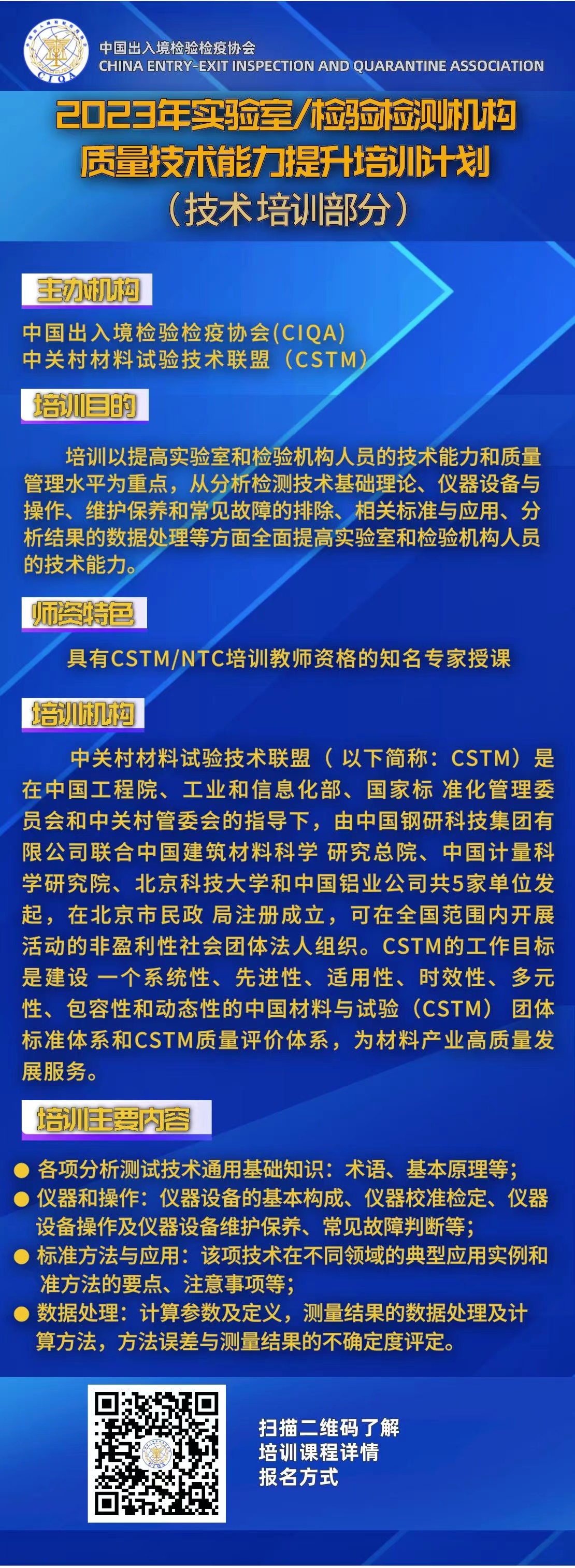 您现在的位置是:首页 > 工作动态与通知公告 2023培训计划 | 实验室/检验检测机构质量技术能力提升 发布日期:2022-12-15 字体: 【小】 【中】 【大】 分享: 热门文章: 接棒启新航 聚力向未来 | 中国出入境检验检疫协会第六届第一次会员代表大会[2026-01-28] 检测和校准实验室认可技术培训班在西安成功举办[2025-12-16] 重磅!中国出入境检验检疫协会国际贸易便利化分会正式成立[2025-11-22] 第七届国际检博会圆满举办:链动全产业链,共启检验检测新生态[2025-11-17] 中国出入境检验检疫协会参加第八届中国国际进口博览会及相关活动[2025-11-11] 海关资讯 2025年港珠澳大桥口岸进出口货值超3000亿元 去年全国海关查获外来物种5439批次——防范口岸入侵风险取得突出成效 覆盖全球约1/3经济总量,RCEP正式生效四年了——“家门口”的外贸生意越来越旺 粤港澳大湾区内地九市外贸规模创历史新高 海关总署公告2026年第12号(关于启动进出口货物多式联运(海铁、水水部分)业务模式试点相关事项的公告) 海关总署 农业农村部公告2026年第11号(关于解除巴西南里奥格郎德州新城疫疫情禁令的公告) “十五五”时期海关将适度扩大进口 海南自贸港封关运作“满月”