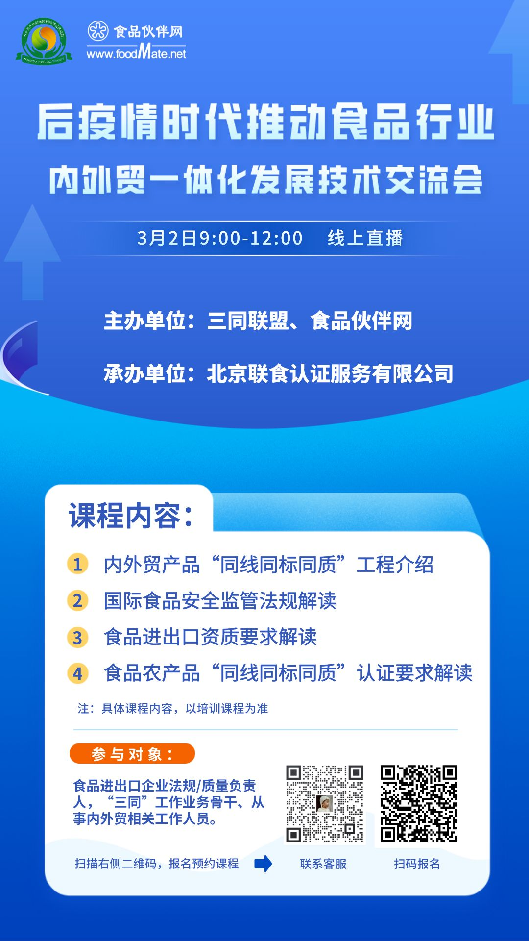 为贯彻落实《国务院办公厅关于支持出口产品转内销的实施意见》(国办发〔2020〕16号)、《国家市场监督管理总局 商务部关于推进内外贸产品“同线同标同质”工作的通知》(国市监认证发〔2021〕76号)精神,促进内外贸一体化发展,推动“同线同标同质”工作,支持出口产品开拓国内市场,帮助外贸企业纾困,内外贸产品“同线同标同质”促进联盟(以下简称“三同联盟”)联合食品伙伴网采取线上直播方式举办“后疫情时代推动食品行业内外贸一体化发展技术交流会”,现将有关事项通知如下: