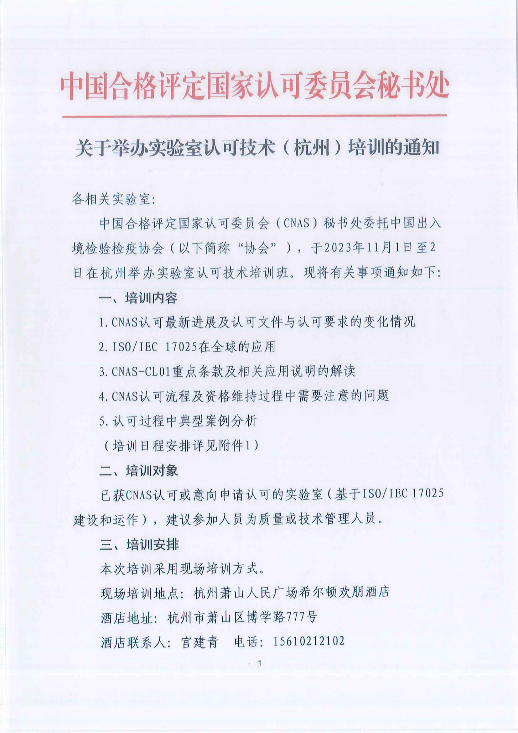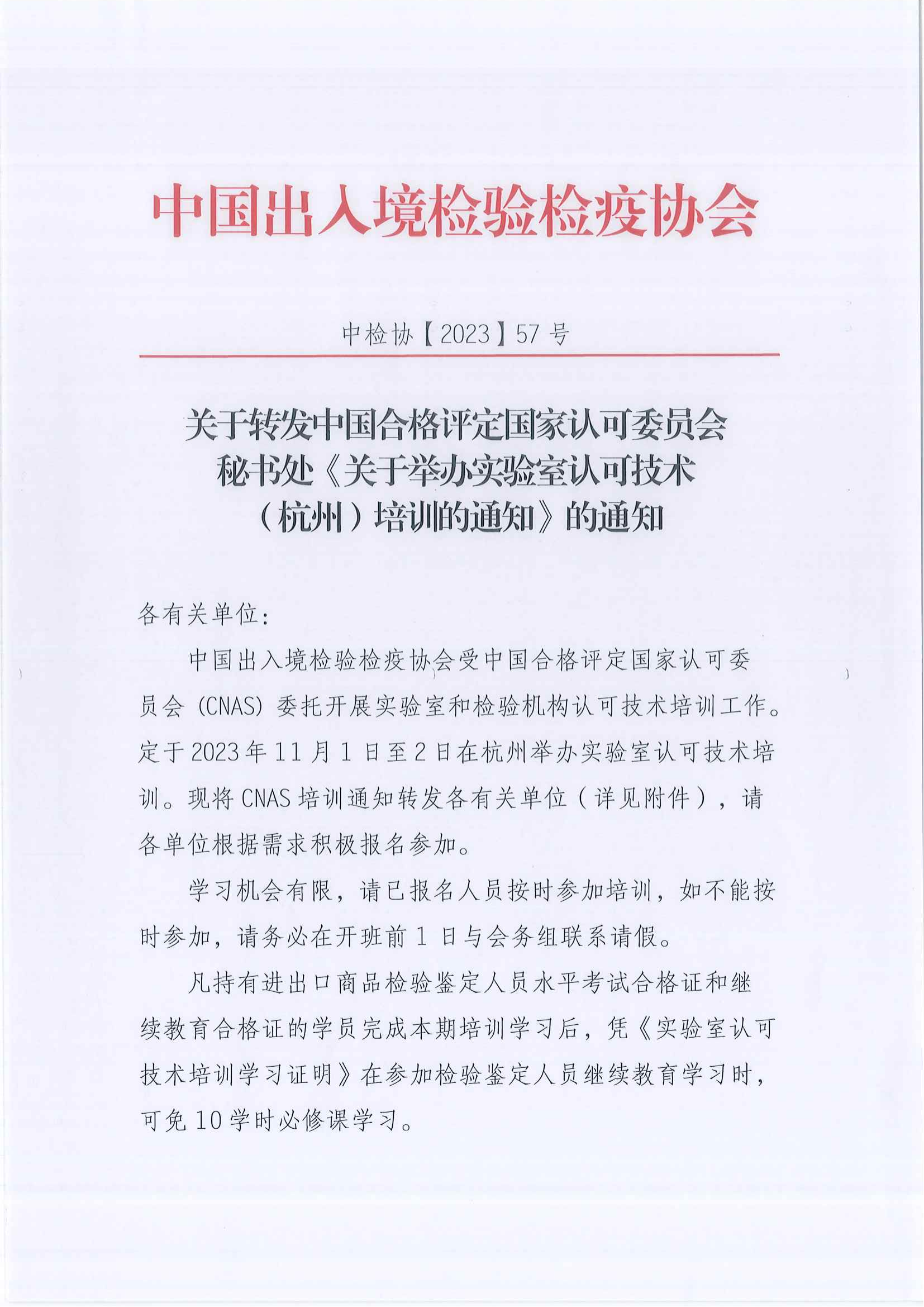 您现在的位置是:首页 > 工作动态与通知公告 关于转发中国合格评定国家认可委员会秘书处《关于举办实验室认可技术(杭州)培训的通知》的通知 发布日期:2023-10-25 字体: 【小】 【中】 【大】 分享: 热门文章: 接棒启新航 聚力向未来 | 中国出入境检验检疫协会第六届第一次会员代表大会[2026-01-28] 检测和校准实验室认可技术培训班在西安成功举办[2025-12-16] 重磅!中国出入境检验检疫协会国际贸易便利化分会正式成立[2025-11-22] 第七届国际检博会圆满举办:链动全产业链,共启检验检测新生态[2025-11-17] 中国出入境检验检疫协会参加第八届中国国际进口博览会及相关活动[2025-11-11] 海关资讯 2025年港珠澳大桥口岸进出口货值超3000亿元 去年全国海关查获外来物种5439批次——防范口岸入侵风险取得突出成效 覆盖全球约1/3经济总量,RCEP正式生效四年了——“家门口”的外贸生意越来越旺 粤港澳大湾区内地九市外贸规模创历史新高 海关总署公告2026年第12号(关于启动进出口货物多式联运(海铁、水水部分)业务模式试点相关事项的公告) 海关总署 农业农村部公告2026年第11号(关于解除巴西南里奥格郎德州新城疫疫情禁令的公告) “十五五”时期海关将适度扩大进口 海南自贸港封关运作“满月”