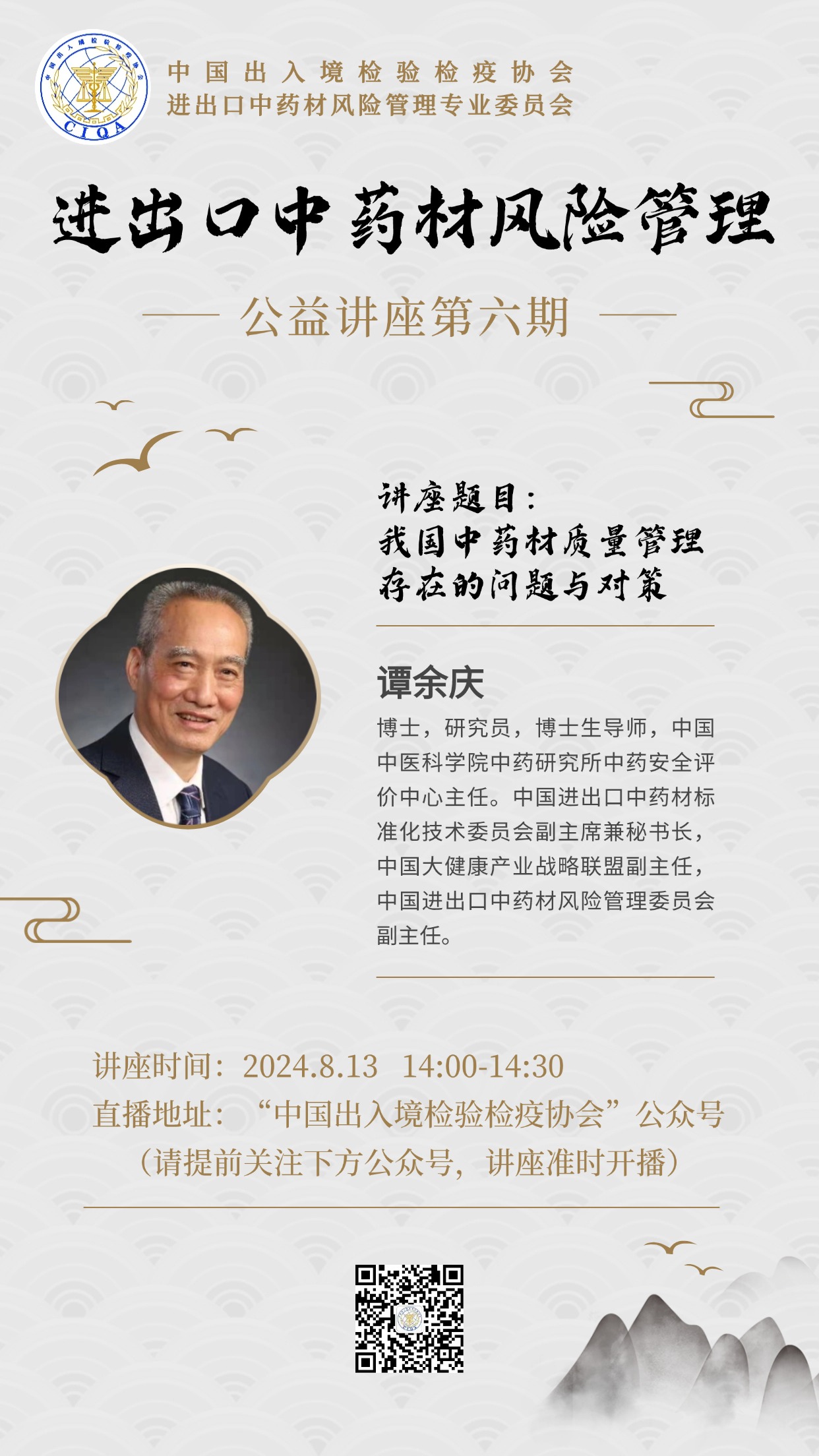 您现在的位置是:首页 > 工作动态与通知公告 进出口中药材风险管理第六期公益讲座 发布日期:2024-08-07 字体: 【小】 【中】 【大】 分享: 热门文章: 接棒启新航 聚力向未来 | 中国出入境检验检疫协会第六届第一次会员代表大会[2026-01-28] 检测和校准实验室认可技术培训班在西安成功举办[2025-12-16] 重磅!中国出入境检验检疫协会国际贸易便利化分会正式成立[2025-11-22] 第七届国际检博会圆满举办:链动全产业链,共启检验检测新生态[2025-11-17] 中国出入境检验检疫协会参加第八届中国国际进口博览会及相关活动[2025-11-11] 海关资讯 2025年港珠澳大桥口岸进出口货值超3000亿元 去年全国海关查获外来物种5439批次——防范口岸入侵风险取得突出成效 覆盖全球约1/3经济总量,RCEP正式生效四年了——“家门口”的外贸生意越来越旺 粤港澳大湾区内地九市外贸规模创历史新高 海关总署公告2026年第12号(关于启动进出口货物多式联运(海铁、水水部分)业务模式试点相关事项的公告) 海关总署 农业农村部公告2026年第11号(关于解除巴西南里奥格郎德州新城疫疫情禁令的公告) “十五五”时期海关将适度扩大进口 海南自贸港封关运作“满月”