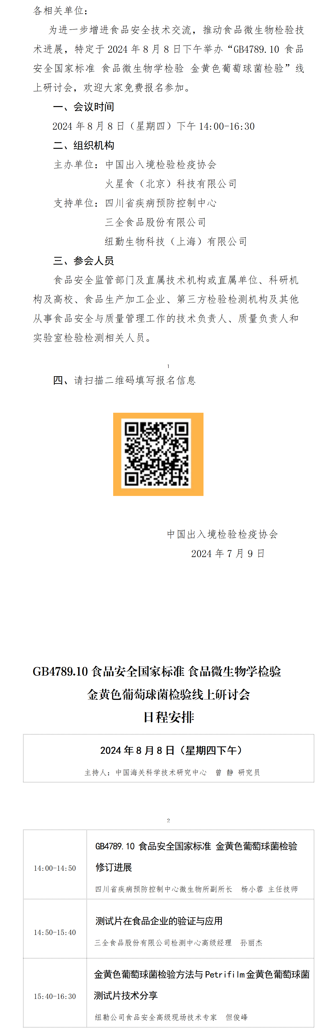 您现在的位置是:首页 > 工作动态与通知公告 关于举办“GB4789.10 食品安全国家标准食品微生物学检验 金黄色葡萄球菌检验”线上研讨会的通知 发布日期:2024-08-07 字体: 【小】 【中】 【大】 分享: 热门文章: 接棒启新航 聚力向未来 | 中国出入境检验检疫协会第六届第一次会员代表大会[2026-01-28] 检测和校准实验室认可技术培训班在西安成功举办[2025-12-16] 重磅!中国出入境检验检疫协会国际贸易便利化分会正式成立[2025-11-22] 第七届国际检博会圆满举办:链动全产业链,共启检验检测新生态[2025-11-17] 中国出入境检验检疫协会参加第八届中国国际进口博览会及相关活动[2025-11-11] 海关资讯 2025年港珠澳大桥口岸进出口货值超3000亿元 去年全国海关查获外来物种5439批次——防范口岸入侵风险取得突出成效 覆盖全球约1/3经济总量,RCEP正式生效四年了——“家门口”的外贸生意越来越旺 粤港澳大湾区内地九市外贸规模创历史新高 海关总署公告2026年第12号(关于启动进出口货物多式联运(海铁、水水部分)业务模式试点相关事项的公告) 海关总署 农业农村部公告2026年第11号(关于解除巴西南里奥格郎德州新城疫疫情禁令的公告) “十五五”时期海关将适度扩大进口 海南自贸港封关运作“满月”