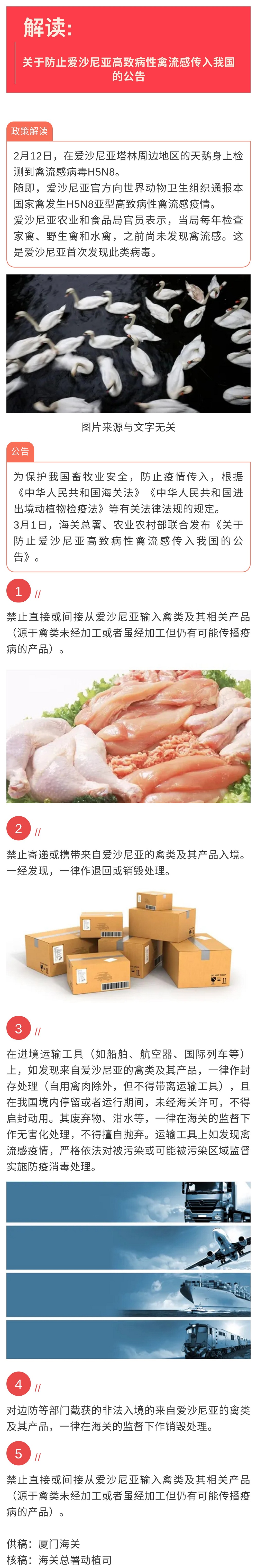 您现在的位置是:首页 > 海关资讯 解读:关于防止爱沙尼亚高致病性禽流感传入我国的公告 发布日期:2021-11-12 字体: 【小】 【中】 【大】 分享: 热门文章: 接棒启新航 聚力向未来 | 中国出入境检验检疫协会第六届第一次会员代表大会[2026-01-28] 检测和校准实验室认可技术培训班在西安成功举办[2025-12-16] 重磅!中国出入境检验检疫协会国际贸易便利化分会正式成立[2025-11-22] 第七届国际检博会圆满举办:链动全产业链,共启检验检测新生态[2025-11-17] 中国出入境检验检疫协会参加第八届中国国际进口博览会及相关活动[2025-11-11] 海关资讯 2025年港珠澳大桥口岸进出口货值超3000亿元 去年全国海关查获外来物种5439批次——防范口岸入侵风险取得突出成效 覆盖全球约1/3经济总量,RCEP正式生效四年了——“家门口”的外贸生意越来越旺 粤港澳大湾区内地九市外贸规模创历史新高 海关总署公告2026年第12号(关于启动进出口货物多式联运(海铁、水水部分)业务模式试点相关事项的公告) 海关总署 农业农村部公告2026年第11号(关于解除巴西南里奥格郎德州新城疫疫情禁令的公告) “十五五”时期海关将适度扩大进口 海南自贸港封关运作“满月”