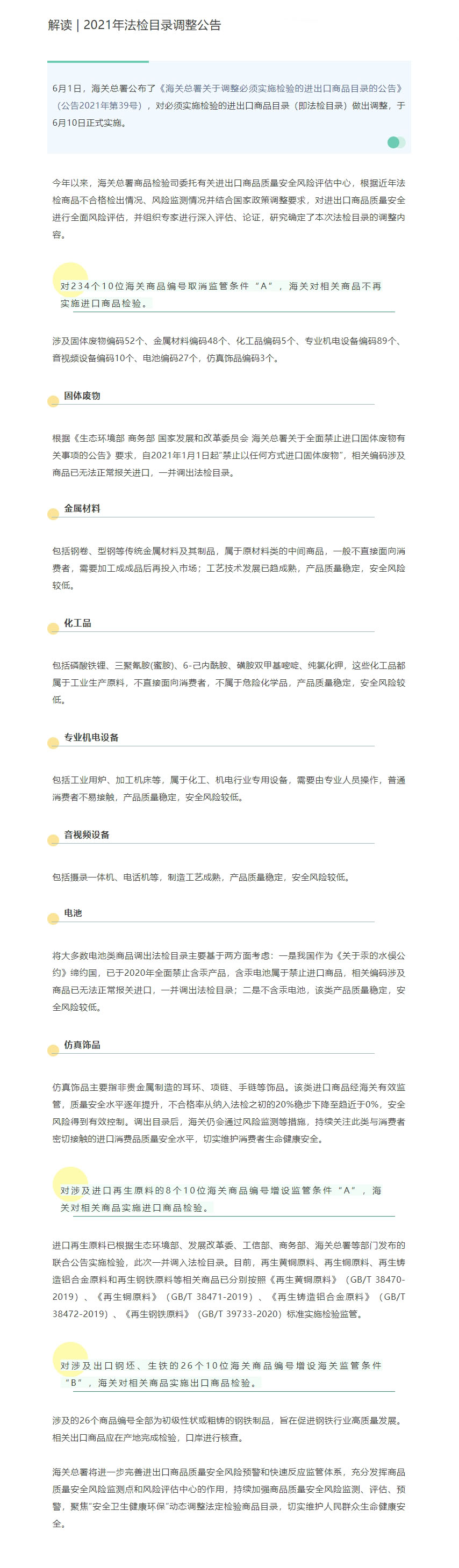 您现在的位置是:首页 > 海关资讯 解读|2021年法检目录调整公告 发布日期:2021-12-06 字体: 【小】 【中】 【大】 分享: 热门文章: 接棒启新航 聚力向未来 | 中国出入境检验检疫协会第六届第一次会员代表大会[2026-01-28] 检测和校准实验室认可技术培训班在西安成功举办[2025-12-16] 重磅!中国出入境检验检疫协会国际贸易便利化分会正式成立[2025-11-22] 第七届国际检博会圆满举办:链动全产业链,共启检验检测新生态[2025-11-17] 中国出入境检验检疫协会参加第八届中国国际进口博览会及相关活动[2025-11-11] 海关资讯 2025年港珠澳大桥口岸进出口货值超3000亿元 去年全国海关查获外来物种5439批次——防范口岸入侵风险取得突出成效 覆盖全球约1/3经济总量,RCEP正式生效四年了——“家门口”的外贸生意越来越旺 粤港澳大湾区内地九市外贸规模创历史新高 海关总署公告2026年第12号(关于启动进出口货物多式联运(海铁、水水部分)业务模式试点相关事项的公告) 海关总署 农业农村部公告2026年第11号(关于解除巴西南里奥格郎德州新城疫疫情禁令的公告) “十五五”时期海关将适度扩大进口 海南自贸港封关运作“满月”