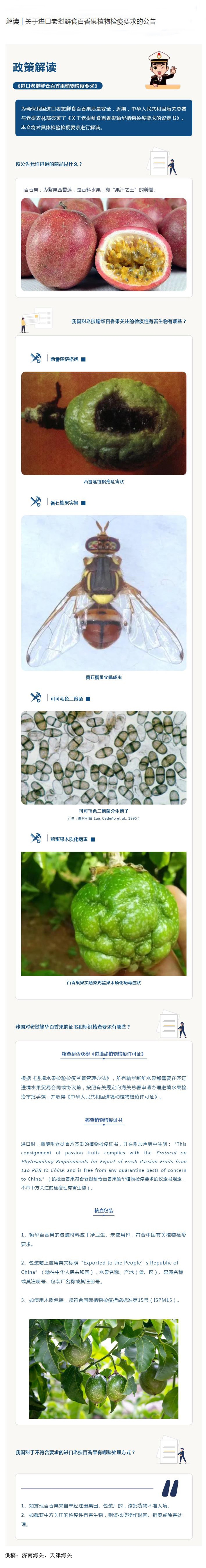 您现在的位置是:首页 > 海关资讯 关于进口老挝鲜食百香果植物检疫要求的公告 发布日期:2021-11-24 字体: 【小】 【中】 【大】 分享: 热门文章: 第六届国际检验检测技术与装备博览会在广州成功举办[2024-12-24] 2024检验检测与科学仪器跨年大聚会在粤隆重开幕![2024-12-22] 2024年I2SL国际可持续发展实验室会议成功举办[2024-12-09] 中国出入境检验检疫协会与国际可持续发展实验室协会签署合作备忘录[2024-12-09] 中国出入境检验检疫协会与新华网政企服务平台合作签约[2024-12-03] 海关资讯 海关总署公告2024年第196号(关于废止和宣布失效部分规范性文件(一)的公告) 稳外贸、稳外资 明年工作这么干 前11个月我国货物贸易进出口增长4.9% 稳增长、拓渠道——看外贸行业新亮点 多方发力蓄动能,我国外贸可望平稳收官 政策解读丨海关总署关于进口新加坡养殖水产品检验检疫要求的公告 海关总署公告2024年第188号(关于进口哈萨克斯坦牛皮检疫和卫生要求的公告) 海关总署公告2024年第186号(关于进口新加坡养殖水产品检验检疫要求的公告)