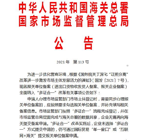 为进一步优化营商环境,落实《国务院关于深化“证照分离”改革进一步激发市场主体发展活力的通知》(国发〔2021〕7号),海关总署和市场监管总局联合发布公告(公告〔2021〕113号),决定将报关单位备案(进出口货物收发货人备案、报关企业备案)全面纳入“多证合一”改革。