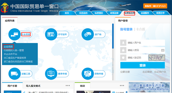 登录“中国国际贸易单一窗口”( https://www.singlewindow.cn/),完成注册后,点击标准版应用––企业资质––企业资质。