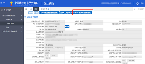 点击海关企业通用资质–企业备案–备案申请,点击上方“打印《报关单位备案证明》”。下载后进行打印。