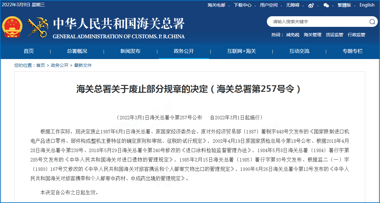 2022年3月1日,海关总署发布第257号令,决定废止部分规章 ,自2022年3月1日起施行。
