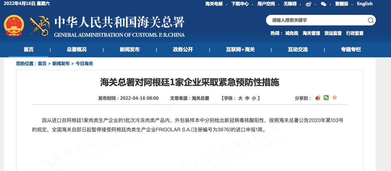4月16日,进口自阿根廷1家肉类生产企业的1批次冷冻肉类产品内、外包装样本中分别检出新冠病毒核酸阳性,全国海关自即日起暂停接受阿根廷肉类生产企业FRIGOLAR S.A.(注册编号为3676)的进口申报1周。