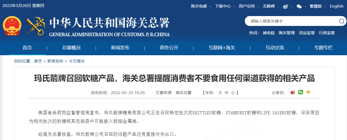 据海关总署网站消息,美国食品药物监督管理局宣布,玛氏箭牌糖果有限公司正在召回特定批次的SKITTLES软糖、STARBURST软糖和LIFE SAVERS软糖,召回原因为相关批次的软糖或其包装袋中可能嵌入极细金属线。