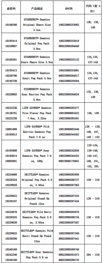 1.暂不通过任何渠道购买玛氏箭牌糖果有限公司正在召回特定批次的SKITTLES软糖、STARBURST软糖和LIFE SAVERS软糖产品(具体产品信息请见附表)。