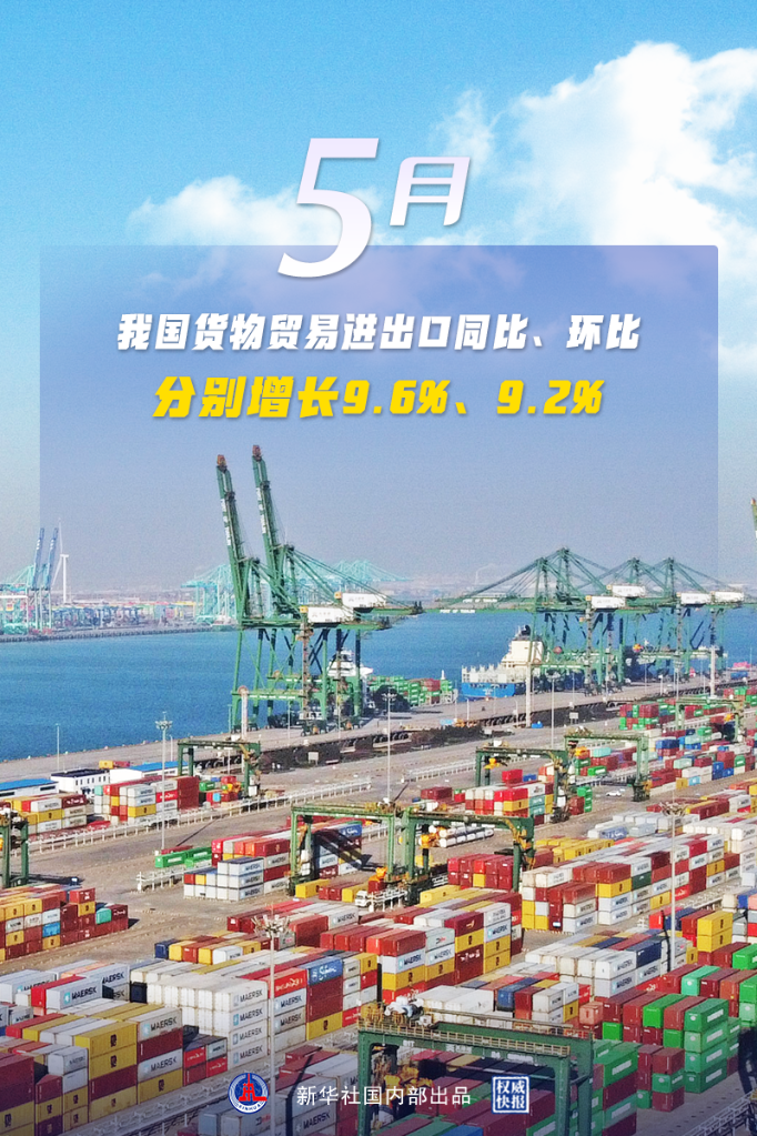 单月来看,5月份,我国货物贸易进出口总值3.45万亿元,同比增长9.6%。其中,出口1.98万亿元,增长15.3%;进口1.47万亿元,增长2.8%。