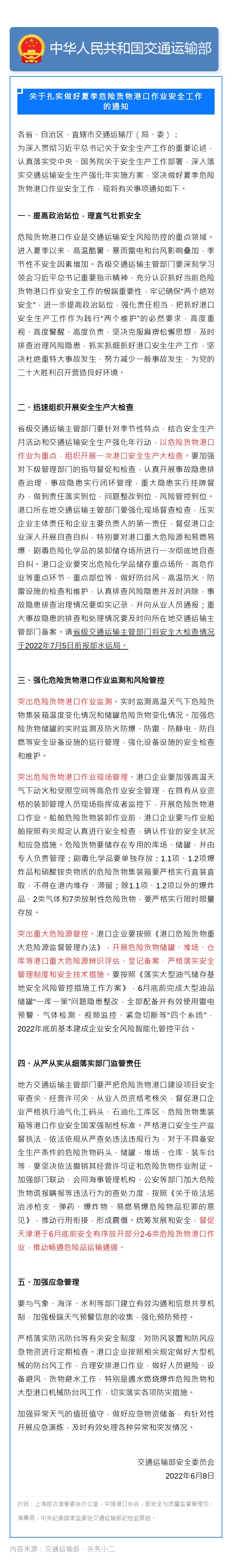 您现在的位置是:首页 > 海关资讯 交通运输部刚刚通知,这些危险货物港口将开展安全工作大检查 发布日期:2022-06-16 字体: 【小】 【中】 【大】 分享: 热门文章: 2024检验检测与科学仪器跨年大聚会在粤隆重开幕![2024-12-22] 2024年I2SL国际可持续发展实验室会议成功举办[2024-12-09] 中国出入境检验检疫协会与国际可持续发展实验室协会签署合作备忘录[2024-12-09] 中国出入境检验检疫协会与新华网政企服务平台合作签约[2024-12-03] 携手共进 青春无“艾”-青年突击队参加世界艾滋病日主题活动[2024-12-02] 海关资讯 海关总署公告2024年第196号(关于废止和宣布失效部分规范性文件(一)的公告) 稳外贸、稳外资 明年工作这么干 前11个月我国货物贸易进出口增长4.9% 稳增长、拓渠道——看外贸行业新亮点 多方发力蓄动能,我国外贸可望平稳收官 政策解读丨海关总署关于进口新加坡养殖水产品检验检疫要求的公告 海关总署公告2024年第188号(关于进口哈萨克斯坦牛皮检疫和卫生要求的公告) 海关总署公告2024年第186号(关于进口新加坡养殖水产品检验检疫要求的公告)