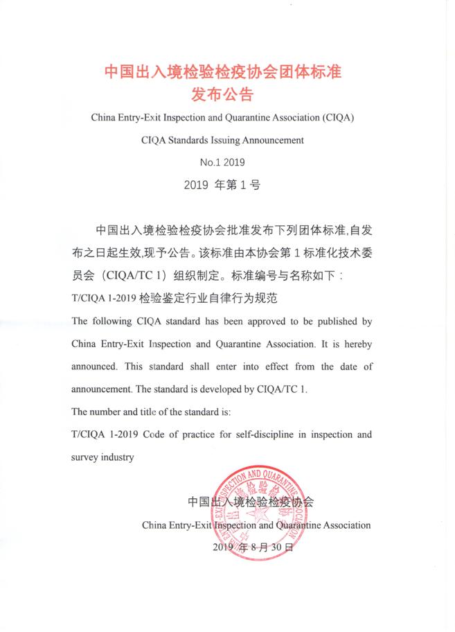 您现在的位置是:首页 > 团体标准文件 中国出入境检验检疫协会团体标准发布公告T/CIQA1-2019检验鉴定行业自律行为规范 发布日期:2019-09-06 字体: 【小】 【中】 【大】 分享: 热门文章: 接棒启新航 聚力向未来 | 中国出入境检验检疫协会第六届第一次会员代表大会[2026-01-28] 检测和校准实验室认可技术培训班在西安成功举办[2025-12-16] 重磅!中国出入境检验检疫协会国际贸易便利化分会正式成立[2025-11-22] 第七届国际检博会圆满举办:链动全产业链,共启检验检测新生态[2025-11-17] 中国出入境检验检疫协会参加第八届中国国际进口博览会及相关活动[2025-11-11] 海关资讯 2025年港珠澳大桥口岸进出口货值超3000亿元 去年全国海关查获外来物种5439批次——防范口岸入侵风险取得突出成效 覆盖全球约1/3经济总量,RCEP正式生效四年了——“家门口”的外贸生意越来越旺 粤港澳大湾区内地九市外贸规模创历史新高 海关总署公告2026年第12号(关于启动进出口货物多式联运(海铁、水水部分)业务模式试点相关事项的公告) 海关总署 农业农村部公告2026年第11号(关于解除巴西南里奥格郎德州新城疫疫情禁令的公告) “十五五”时期海关将适度扩大进口 海南自贸港封关运作“满月”