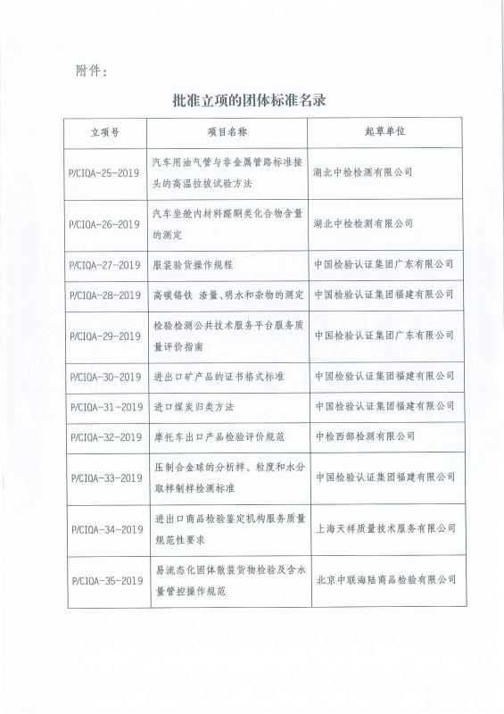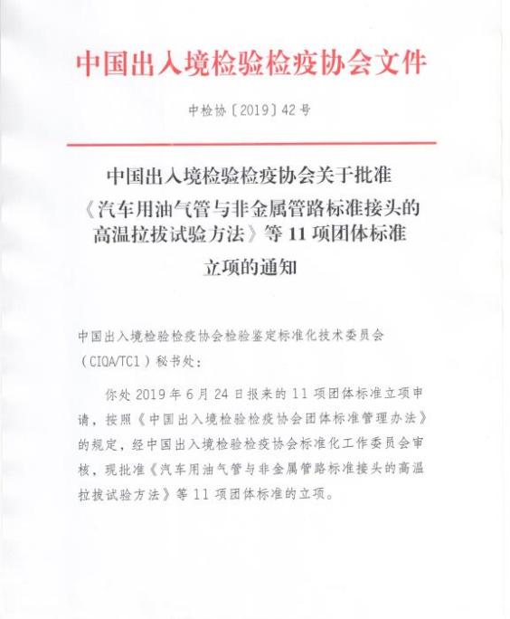 您现在的位置是:首页 > 团体标准文件 中国出入境检验检疫协会关于批准《汽车用油气管与非金属管路标准接头的高温拉拔试验方法》等11项团体标准立项的通知 发布日期:2019-07-23 字体: 【小】 【中】 【大】 分享: 热门文章: 接棒启新航 聚力向未来 | 中国出入境检验检疫协会第六届第一次会员代表大会[2026-01-28] 检测和校准实验室认可技术培训班在西安成功举办[2025-12-16] 重磅!中国出入境检验检疫协会国际贸易便利化分会正式成立[2025-11-22] 第七届国际检博会圆满举办:链动全产业链,共启检验检测新生态[2025-11-17] 中国出入境检验检疫协会参加第八届中国国际进口博览会及相关活动[2025-11-11] 海关资讯 2025年港珠澳大桥口岸进出口货值超3000亿元 去年全国海关查获外来物种5439批次——防范口岸入侵风险取得突出成效 覆盖全球约1/3经济总量,RCEP正式生效四年了——“家门口”的外贸生意越来越旺 粤港澳大湾区内地九市外贸规模创历史新高 海关总署公告2026年第12号(关于启动进出口货物多式联运(海铁、水水部分)业务模式试点相关事项的公告) 海关总署 农业农村部公告2026年第11号(关于解除巴西南里奥格郎德州新城疫疫情禁令的公告) “十五五”时期海关将适度扩大进口 海南自贸港封关运作“满月”
