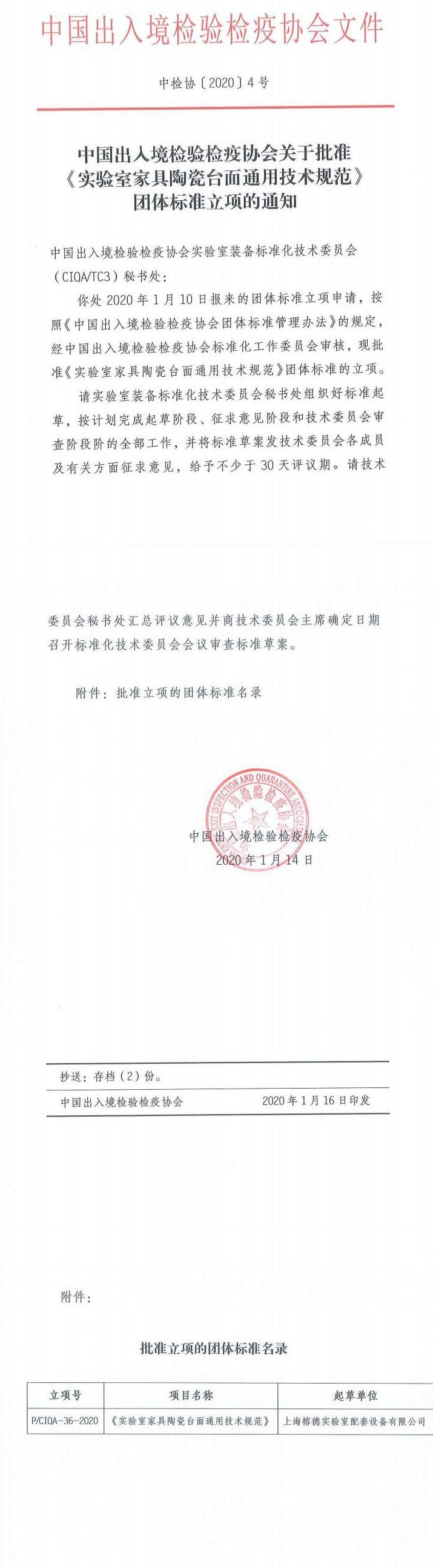 您现在的位置是:首页 > 团体标准文件 中国出入境检验检疫协会关于批准《实验室家具陶瓷台面通用技术规范》团体标准立项的通知 发布日期:2020-01-16 字体: 【小】 【中】 【大】 分享: 热门文章: 接棒启新航 聚力向未来 | 中国出入境检验检疫协会第六届第一次会员代表大会[2026-01-28] 检测和校准实验室认可技术培训班在西安成功举办[2025-12-16] 重磅!中国出入境检验检疫协会国际贸易便利化分会正式成立[2025-11-22] 第七届国际检博会圆满举办:链动全产业链,共启检验检测新生态[2025-11-17] 中国出入境检验检疫协会参加第八届中国国际进口博览会及相关活动[2025-11-11] 海关资讯 2025年港珠澳大桥口岸进出口货值超3000亿元 去年全国海关查获外来物种5439批次——防范口岸入侵风险取得突出成效 覆盖全球约1/3经济总量,RCEP正式生效四年了——“家门口”的外贸生意越来越旺 粤港澳大湾区内地九市外贸规模创历史新高 海关总署公告2026年第12号(关于启动进出口货物多式联运(海铁、水水部分)业务模式试点相关事项的公告) 海关总署 农业农村部公告2026年第11号(关于解除巴西南里奥格郎德州新城疫疫情禁令的公告) “十五五”时期海关将适度扩大进口 海南自贸港封关运作“满月”