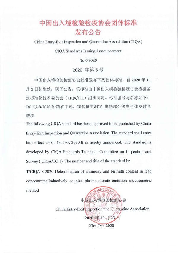 您现在的位置是:首页 > 团体标准文件 中国出入境检验检疫协会团体标准发布公告《铅精矿中锑、铋含量的测定 电感耦合等离子体发射光谱法》 发布日期:2020-10-26 字体: 【小】 【中】 【大】 分享: 热门文章: 接棒启新航 聚力向未来 | 中国出入境检验检疫协会第六届第一次会员代表大会[2026-01-28] 检测和校准实验室认可技术培训班在西安成功举办[2025-12-16] 重磅!中国出入境检验检疫协会国际贸易便利化分会正式成立[2025-11-22] 第七届国际检博会圆满举办:链动全产业链,共启检验检测新生态[2025-11-17] 中国出入境检验检疫协会参加第八届中国国际进口博览会及相关活动[2025-11-11] 海关资讯 2025年港珠澳大桥口岸进出口货值超3000亿元 去年全国海关查获外来物种5439批次——防范口岸入侵风险取得突出成效 覆盖全球约1/3经济总量,RCEP正式生效四年了——“家门口”的外贸生意越来越旺 粤港澳大湾区内地九市外贸规模创历史新高 海关总署公告2026年第12号(关于启动进出口货物多式联运(海铁、水水部分)业务模式试点相关事项的公告) 海关总署 农业农村部公告2026年第11号(关于解除巴西南里奥格郎德州新城疫疫情禁令的公告) “十五五”时期海关将适度扩大进口 海南自贸港封关运作“满月”