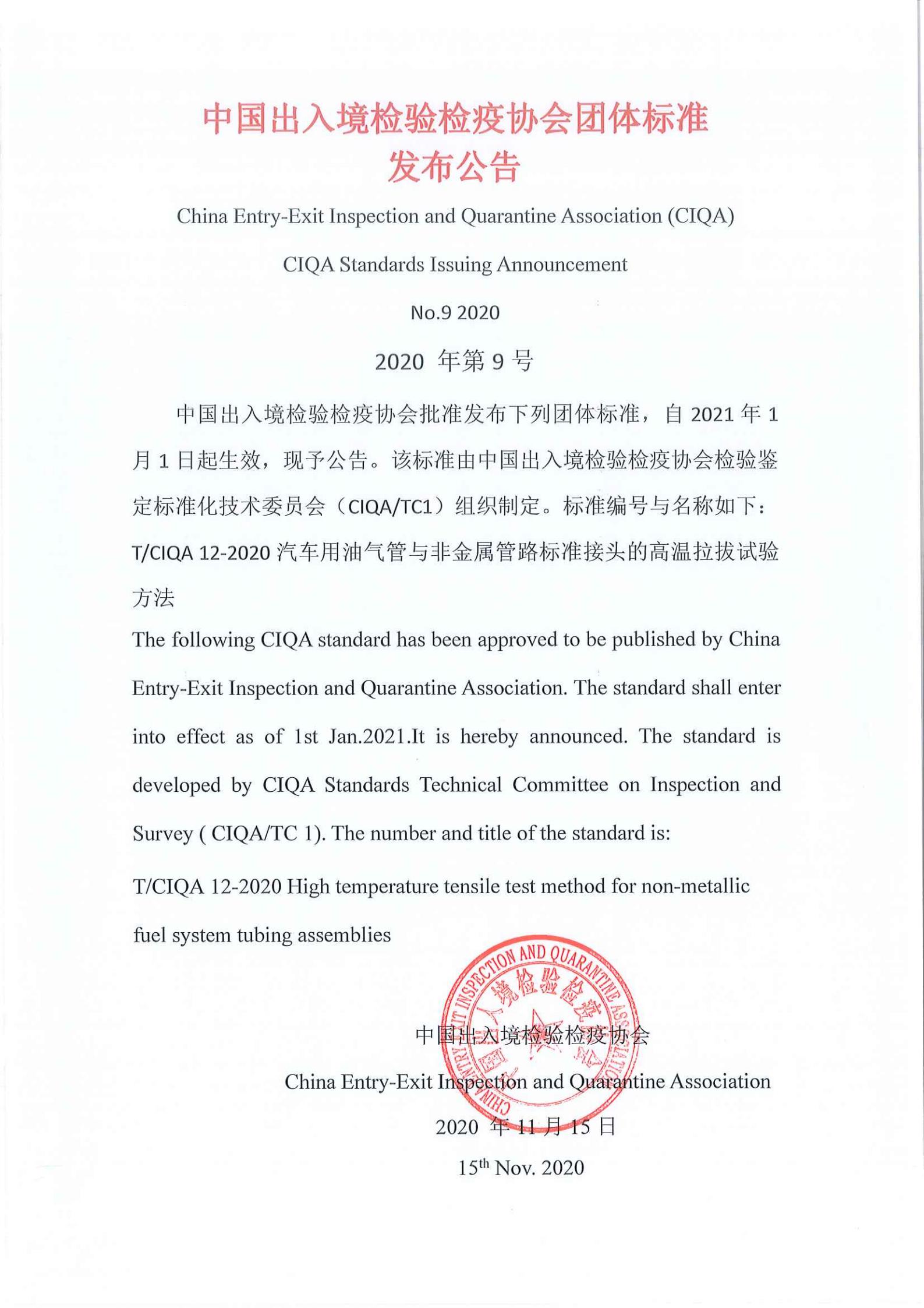 您现在的位置是:首页 > 团体标准文件 中国出入境检验检疫协会团体标准发布公告《汽车用油气管与非金属管路标准接头的高温拉拔试验方法》 发布日期:2020-11-17 字体: 【小】 【中】 【大】 分享: 热门文章: 接棒启新航 聚力向未来 | 中国出入境检验检疫协会第六届第一次会员代表大会[2026-01-28] 检测和校准实验室认可技术培训班在西安成功举办[2025-12-16] 重磅!中国出入境检验检疫协会国际贸易便利化分会正式成立[2025-11-22] 第七届国际检博会圆满举办:链动全产业链,共启检验检测新生态[2025-11-17] 中国出入境检验检疫协会参加第八届中国国际进口博览会及相关活动[2025-11-11] 海关资讯 2025年港珠澳大桥口岸进出口货值超3000亿元 去年全国海关查获外来物种5439批次——防范口岸入侵风险取得突出成效 覆盖全球约1/3经济总量,RCEP正式生效四年了——“家门口”的外贸生意越来越旺 粤港澳大湾区内地九市外贸规模创历史新高 海关总署公告2026年第12号(关于启动进出口货物多式联运(海铁、水水部分)业务模式试点相关事项的公告) 海关总署 农业农村部公告2026年第11号(关于解除巴西南里奥格郎德州新城疫疫情禁令的公告) “十五五”时期海关将适度扩大进口 海南自贸港封关运作“满月”