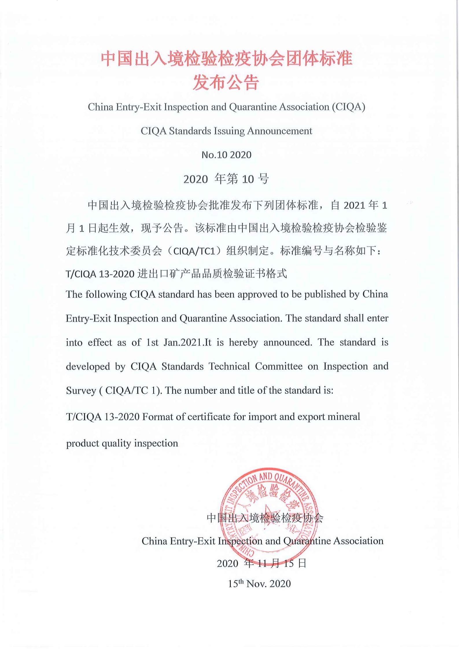 您现在的位置是:首页 > 团体标准文件 中国出入境检验检疫协会团体标准发布公告《进出口矿产品品质检验证书格式》 发布日期:2020-11-17 字体: 【小】 【中】 【大】 分享: 热门文章: 接棒启新航 聚力向未来 | 中国出入境检验检疫协会第六届第一次会员代表大会[2026-01-28] 检测和校准实验室认可技术培训班在西安成功举办[2025-12-16] 重磅!中国出入境检验检疫协会国际贸易便利化分会正式成立[2025-11-22] 第七届国际检博会圆满举办:链动全产业链,共启检验检测新生态[2025-11-17] 中国出入境检验检疫协会参加第八届中国国际进口博览会及相关活动[2025-11-11] 海关资讯 2025年港珠澳大桥口岸进出口货值超3000亿元 去年全国海关查获外来物种5439批次——防范口岸入侵风险取得突出成效 覆盖全球约1/3经济总量,RCEP正式生效四年了——“家门口”的外贸生意越来越旺 粤港澳大湾区内地九市外贸规模创历史新高 海关总署公告2026年第12号(关于启动进出口货物多式联运(海铁、水水部分)业务模式试点相关事项的公告) 海关总署 农业农村部公告2026年第11号(关于解除巴西南里奥格郎德州新城疫疫情禁令的公告) “十五五”时期海关将适度扩大进口 海南自贸港封关运作“满月”