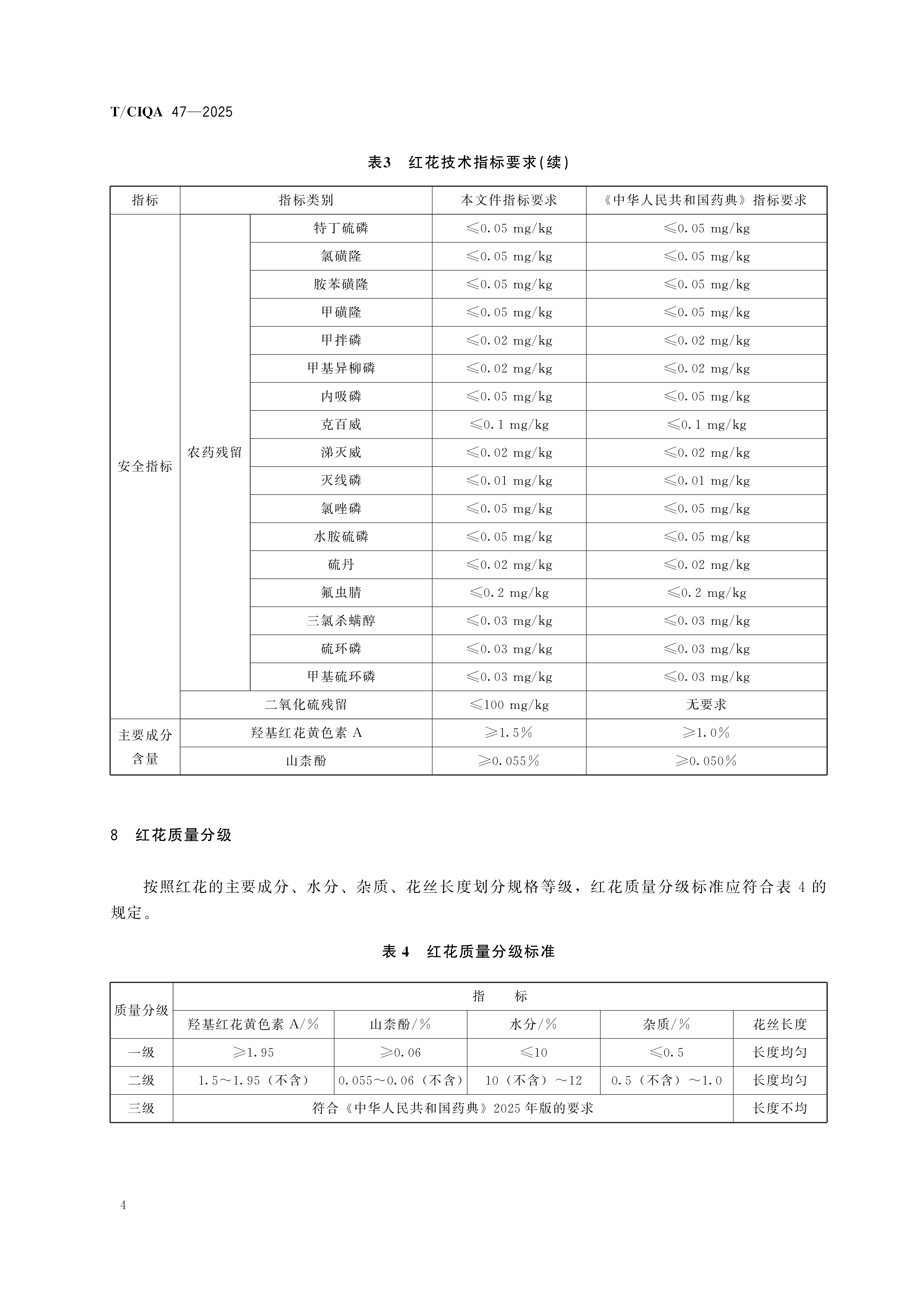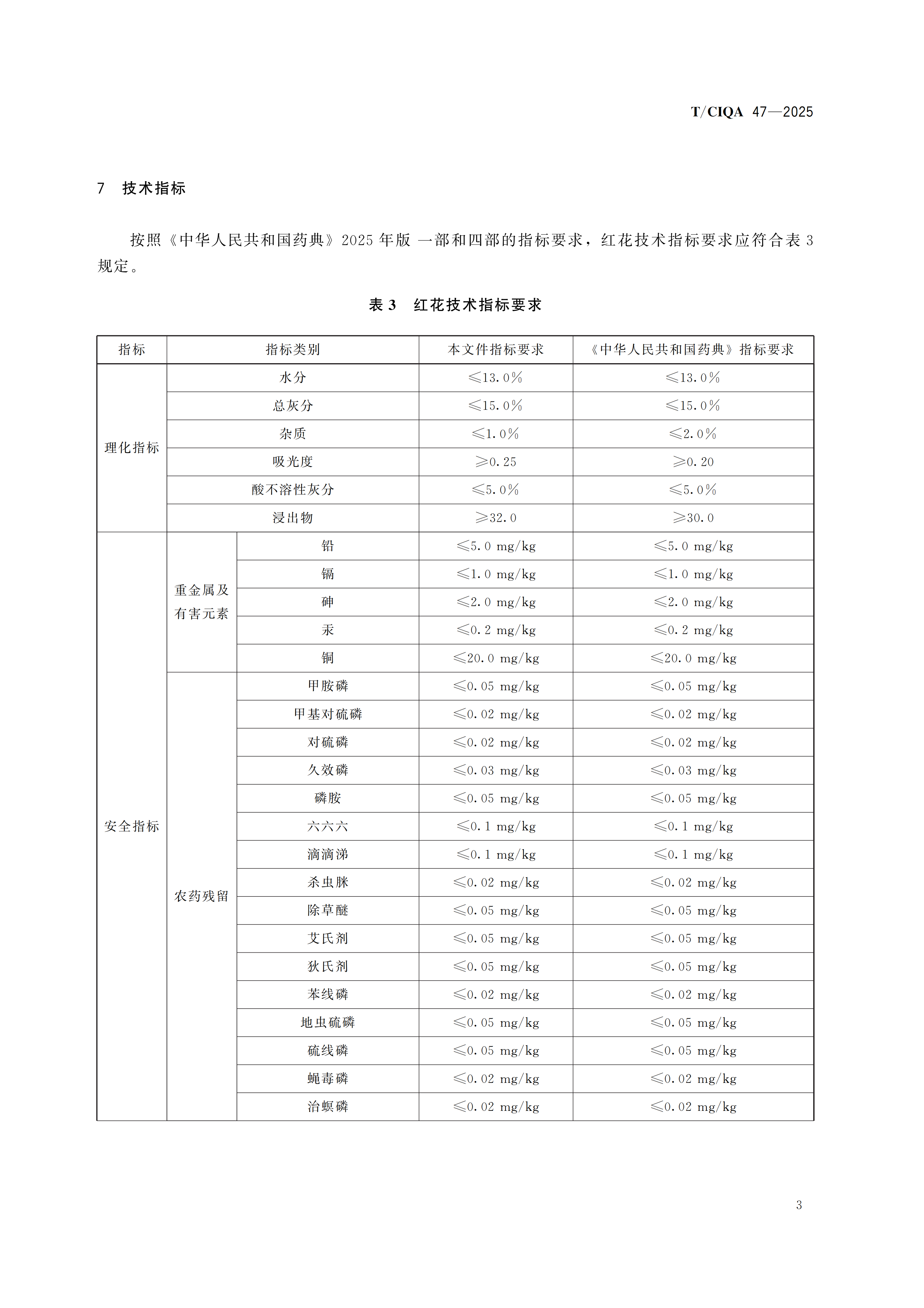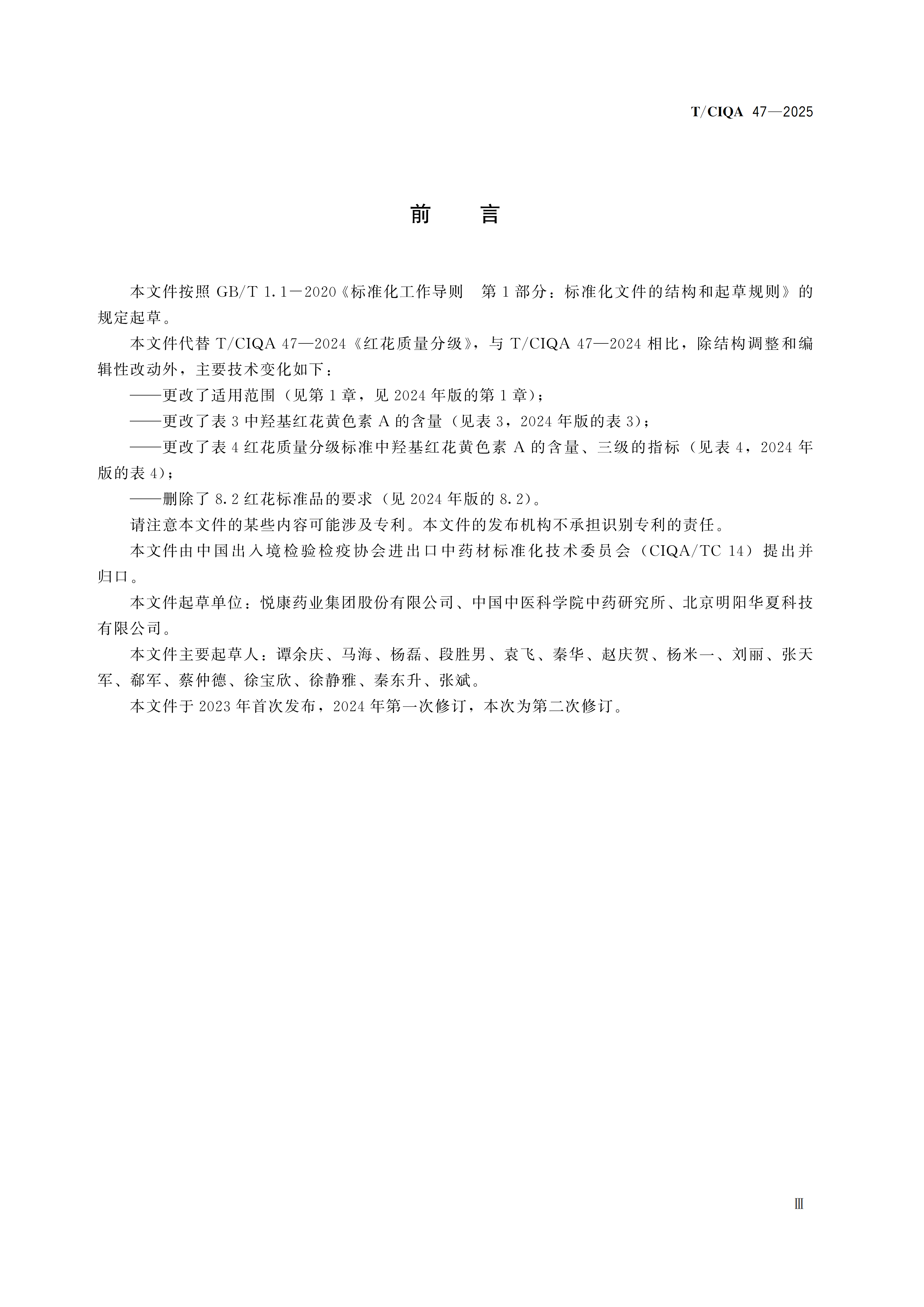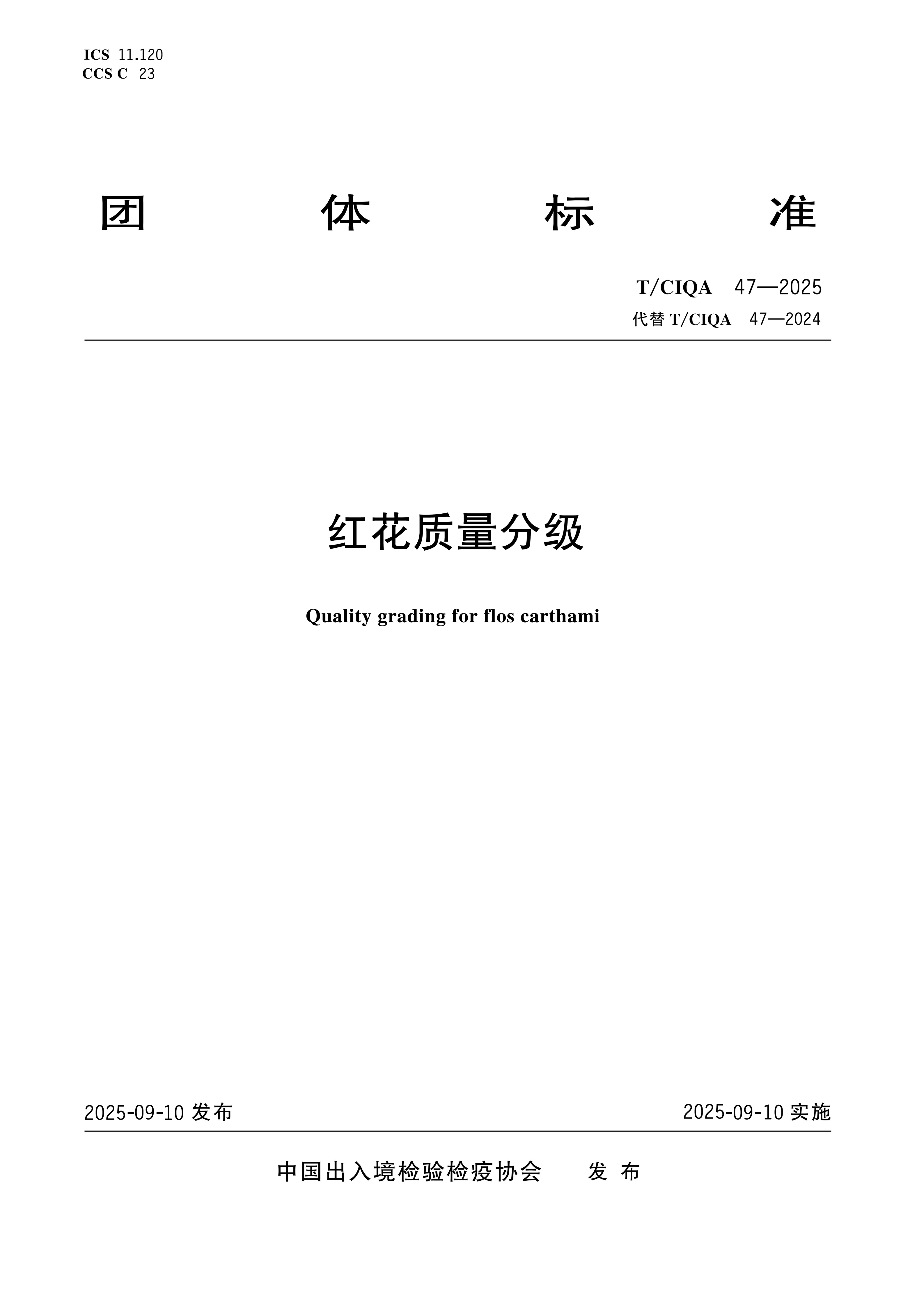 您现在的位置是:首页 > 团体标准文件 TCIQA 47-2022《红花质量分级》 发布日期:2025-12-29 字体: 【小】 【中】 【大】 分享: 热门文章: 接棒启新航 聚力向未来 | 中国出入境检验检疫协会第六届第一次会员代表大会[2026-01-28] 检测和校准实验室认可技术培训班在西安成功举办[2025-12-16] 重磅!中国出入境检验检疫协会国际贸易便利化分会正式成立[2025-11-22] 第七届国际检博会圆满举办:链动全产业链,共启检验检测新生态[2025-11-17] 中国出入境检验检疫协会参加第八届中国国际进口博览会及相关活动[2025-11-11] 海关资讯 2025年港珠澳大桥口岸进出口货值超3000亿元 去年全国海关查获外来物种5439批次——防范口岸入侵风险取得突出成效 覆盖全球约1/3经济总量,RCEP正式生效四年了——“家门口”的外贸生意越来越旺 粤港澳大湾区内地九市外贸规模创历史新高 海关总署公告2026年第12号(关于启动进出口货物多式联运(海铁、水水部分)业务模式试点相关事项的公告) 海关总署 农业农村部公告2026年第11号(关于解除巴西南里奥格郎德州新城疫疫情禁令的公告) “十五五”时期海关将适度扩大进口 海南自贸港封关运作“满月”